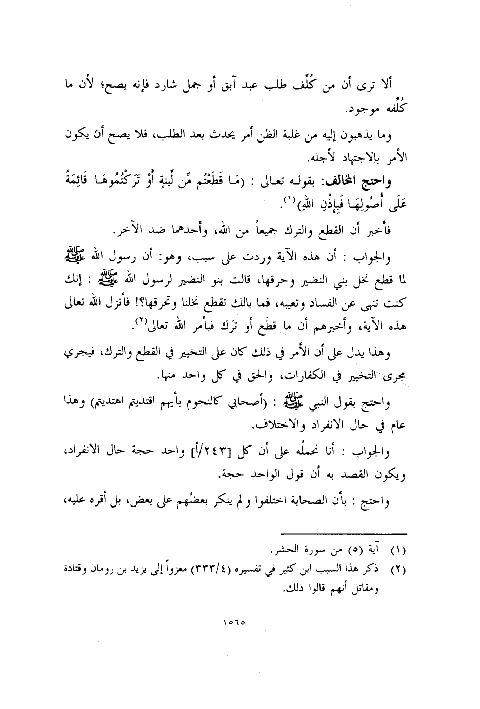 واحتج المخالف: بقوله تعالى: (مَا قَطَعْتُم من لينةٍ أو تَرَكْتُمُوهَا قَائِمَة عَلَى أصولِهَا فَبِإِذْنِ اللهِ) (١) .