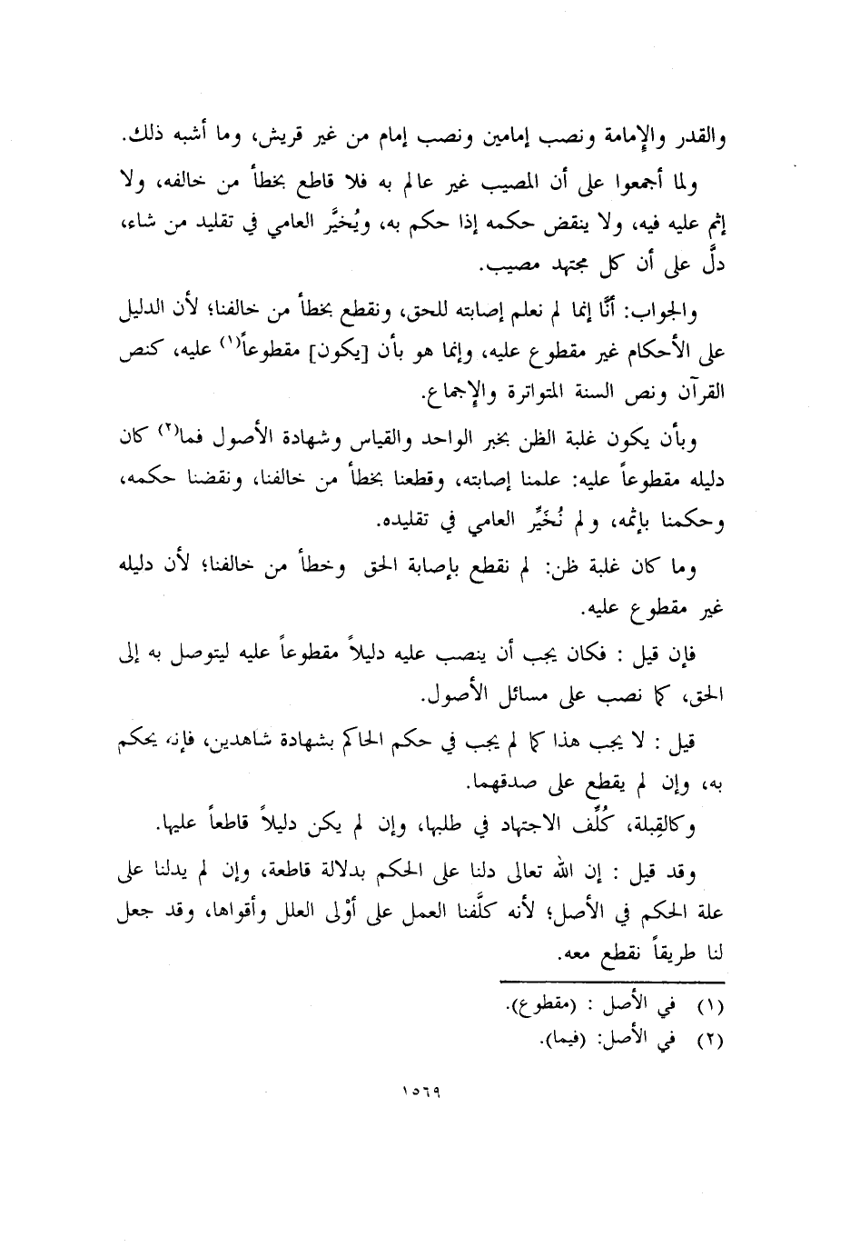 وبأن يكون غلبة الظن بخبر الواحد والقياس وشهادة الأصول فما (٢) كان دليله مقطوعاً عليه: علمنا إصابته، وقطعنا بخطأ من خالفنا، ونقضنا حكمه، وحكمنا بإثمه، ولم نُخَير العامي في تقليده.
