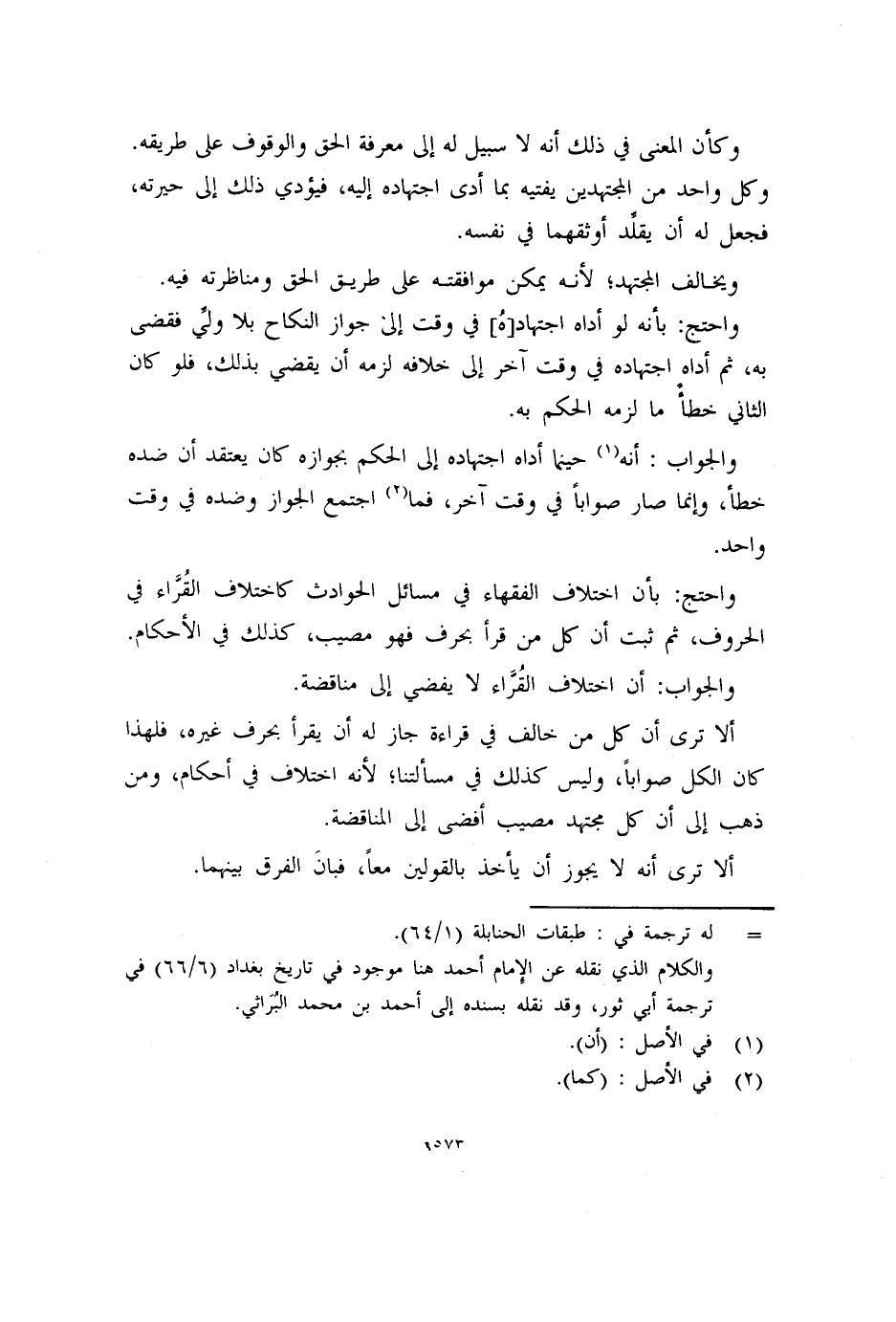 واحتج: بأن اختلاف الفقهاء في مسائل الحوادث كاختلاف القُراء في الحروف، ثم ثبت أن كل من قرأ بحرف فهو مصيب، كذلك في الأحكام.