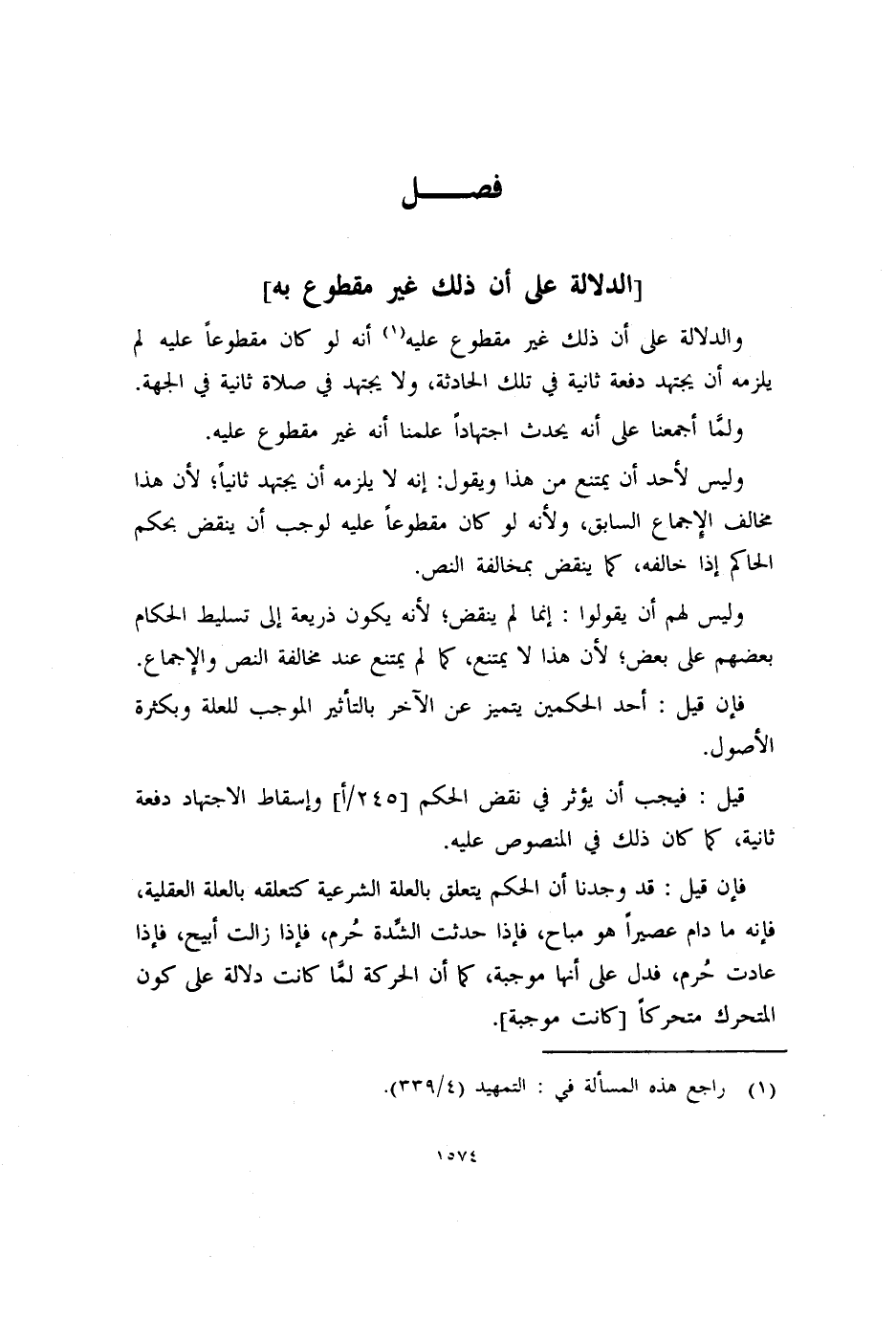 والدلالة على أن ذلك غير مقطوع عليه (١) أنه لو كان مقطوعاً عليه لم يلزمه أن يجتهد دفعة ثانية في تلك الحادثة، ولا يجتهد في صلاة ثانية في الجهة.