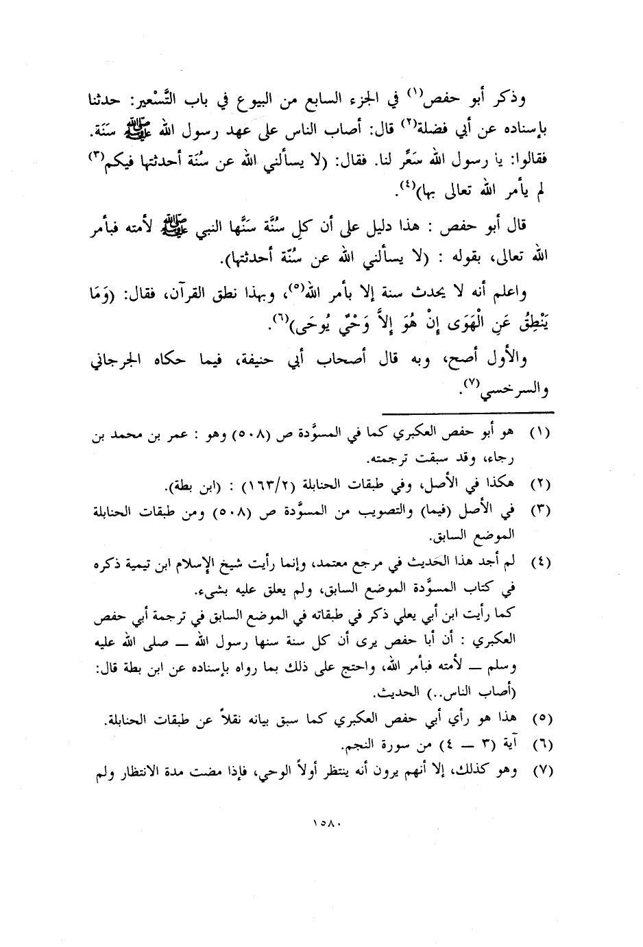 كما رأيت ابن أبي يعلي ذكر في طبقاته في الموضع السابق في ترجمة أبي حفص العكبري: أن أبا حفص يرى أن كل سنة سنها رسول الله - صلى الله عليه وسلم - لأمته فبأمر الله، واحتج على ذلك بما رواه بإسناده عن ابن بطة قال: (أصاب الناس..) الحديث.