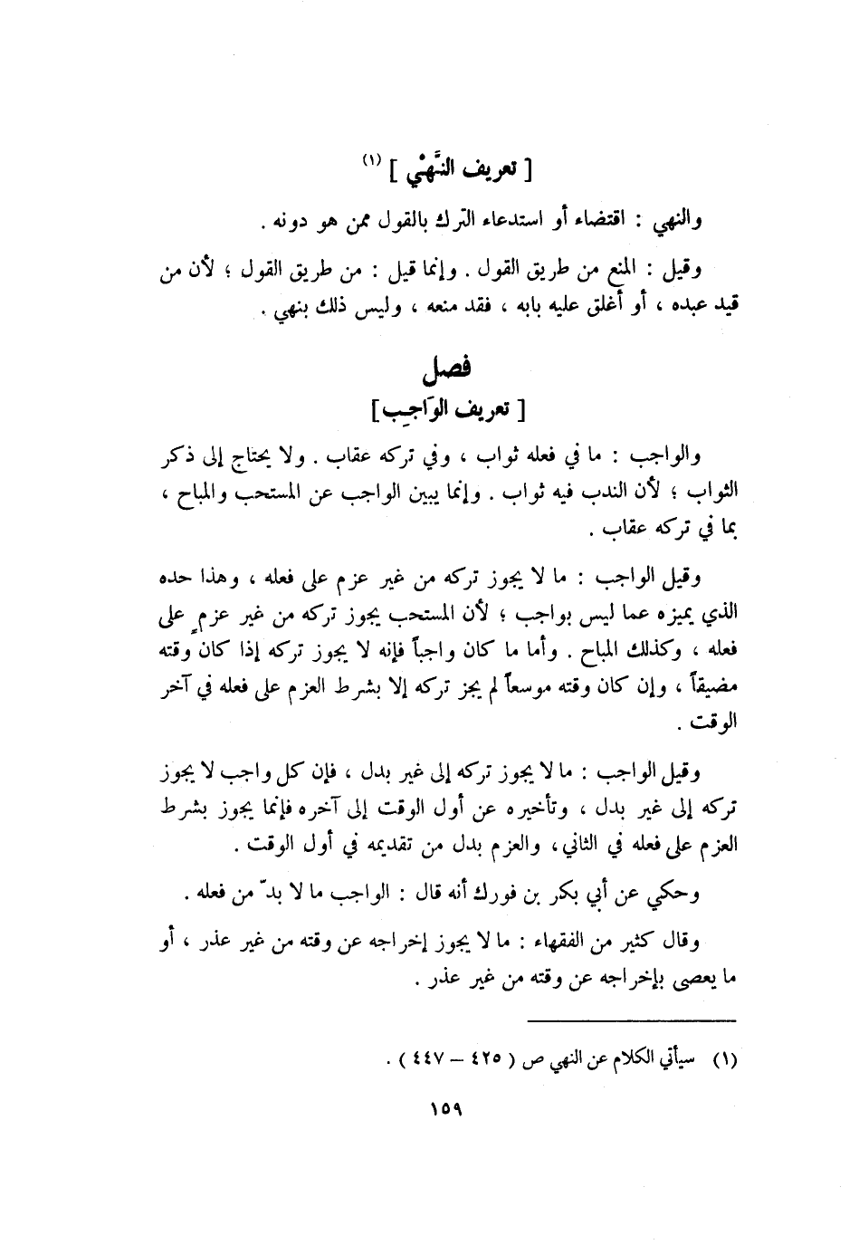 وقيل الواجب: ما لا يجوز تركه من غير عزم على فعله، وهذا حده الذي يميزه عما ليس بواجب؛ لأن المستحب يجوز تركه من غير عزم على فعله، وكذلك المباح. وأما ما كان واجبًا فإنه لا يجوز تركه إذا كان وقته مضيقًا، وإن كان وقته موسعًا لم يجز تركه إلا بشرط العزم على فعله في آخر الوقت.