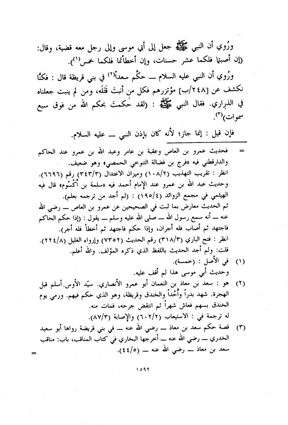 ورُوي أن النبي - صلى الله عليه وسلم - جعل إلى أبي موسى وإلى رجل معه قضية، وقال: (إن أصبتما فلكما عشر حسنات، وإن أخطأتما فلكما خمس (١)) .