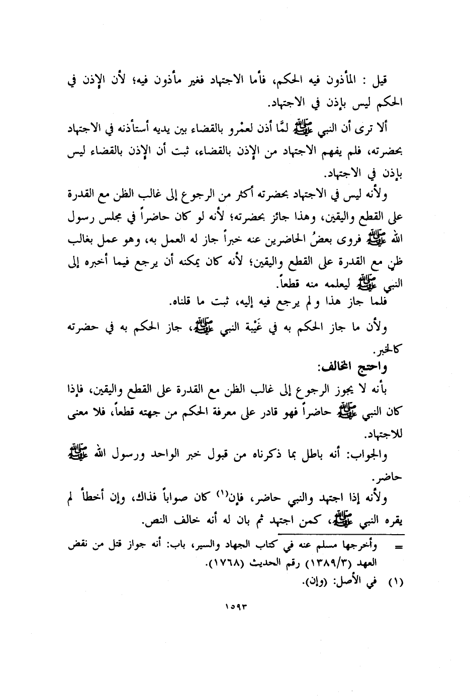 بأنه لا يجوز الرجوع إلى غالب الظن مع القدرة على القطع واليقين، فإذا كان النبي - صلى الله عليه وسلم - حاضراً فهو قادر على معرفة الحكم من جهته قطعاً، فلا معنى للاجتهاد.