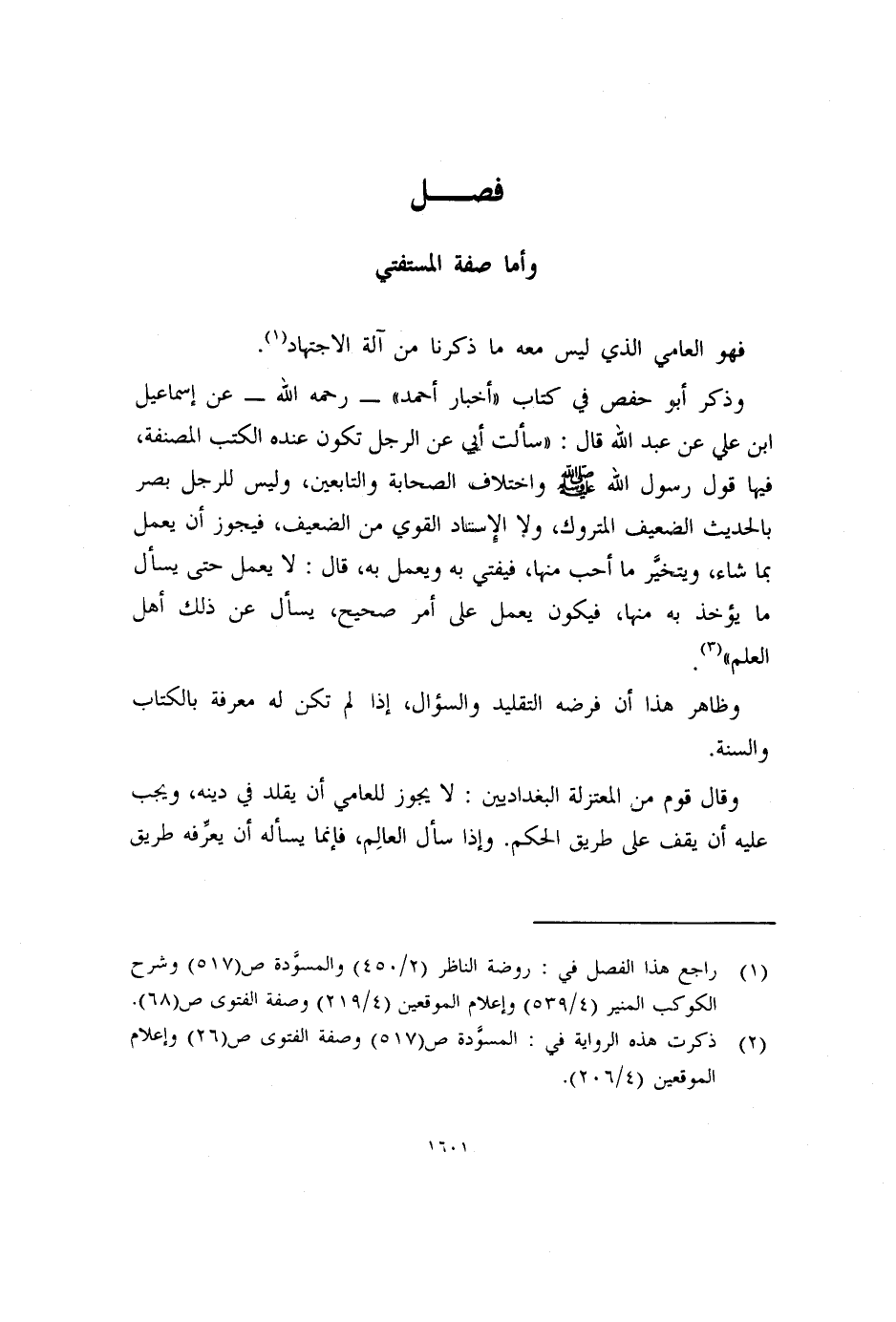 (١) راجع هذا الفصل في: روضة الناظر (٢/٤٥٠) والمسودة ص (٥١٧) وشرح الكوكب المنير (٤/٥٣٩) وإعلام الموقعين (٤/٢١٩) وصفة الفتوى ص (٦٨) .
