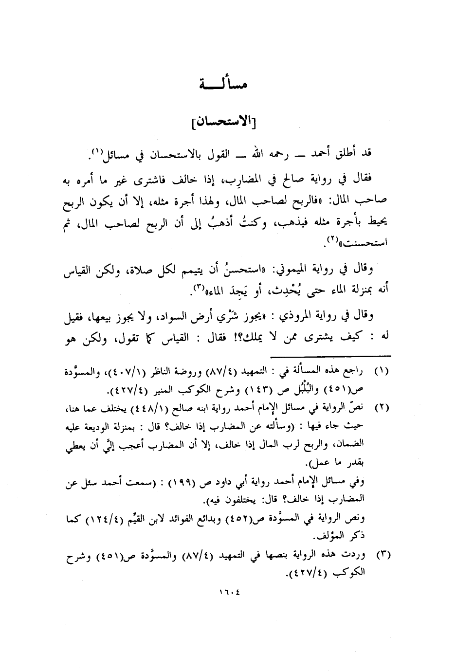 (٢) نصّ الرواية في مسائل الإِمام أحمد رواية ابنه صالح (١/٤٤٨) يختلف عما هنا، حيث جاء فيها: (وسألته عن المضارب إذا خالف؟ قال: بمنزلة الوديعة عليه الضمان، والربح لرب المال إذا خالف، إلا أن المضارب أعجب إليَّ أن يعطي بقدر ما عمل) .