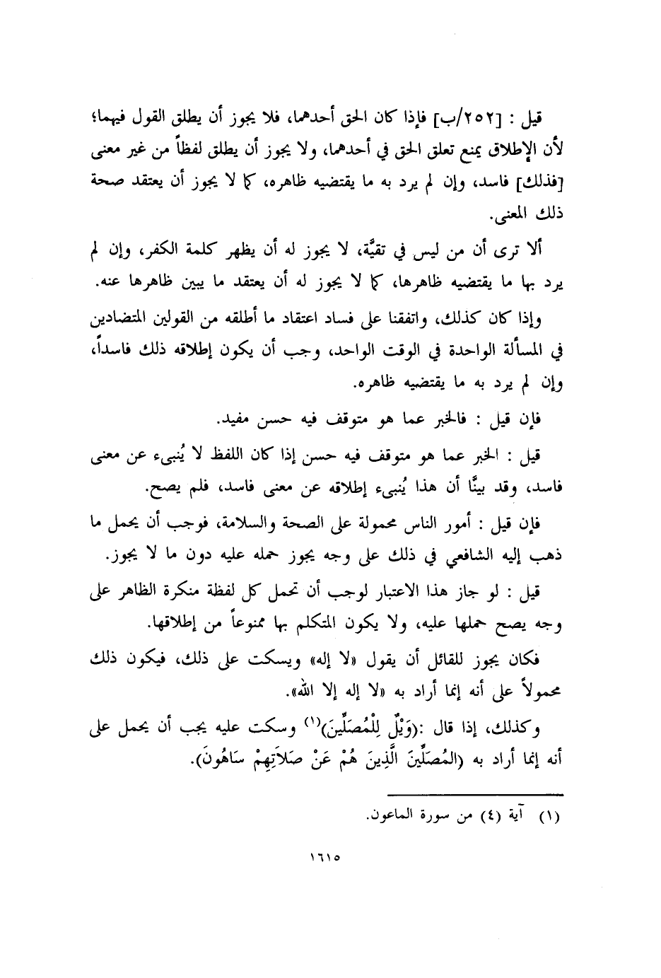 وكذلك، إذا قال: (وَيْل لِلْمُصَلينَ) (١) وسكت عليه يجب أن يحمل على أنه إنما أراد به (المُصَلينَ الَّذِينَ هُمْ عَنْ صَلاَتِهِمْ سَاهُونَ) .