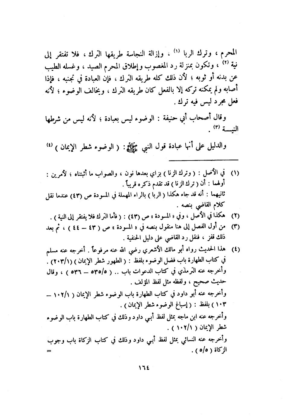المحرم، وترك الربا١. وإزالة النجاسة طريقها الترك، فلا تفتقر إلى نية٢، وتكون بمنزلة رد المغصوب وإطلاق المحرم الصيد، وغسله الطيب عن بدنه أو ثوبه؛ لأن ذلك كله طريقه الترك، فإن العبادة في تجنبه، فإذا أصابه ولم يمكنه تركه إلا بالفعل كان طريقه الترك، ويخالف الوضوء؛ لأنه فعل مجرد ليس فيه ترك.