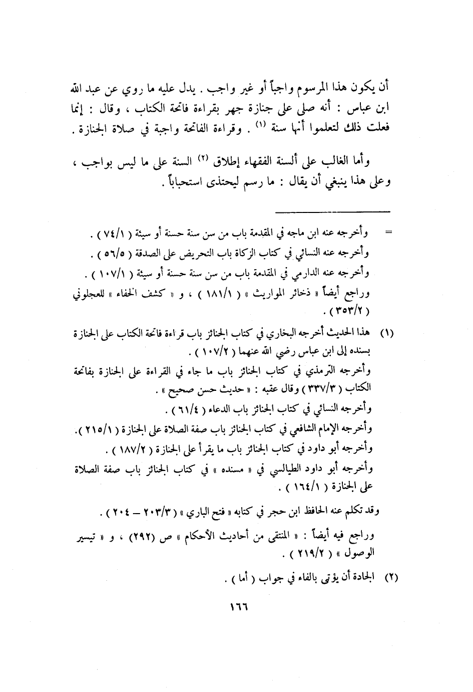 أن يكون هذا المرسوم واجبًا أو غير واجب. يدل عليه ما روي عن عبد الله بن عباس: أنه صلى على جنازة جهر بقراءة فاتحة الكتاب، وقال: إنما فعلت ذلك لتعلموا أنها سنة١. وقراءة الفاتحة واجبة في صلاة الجنازة.