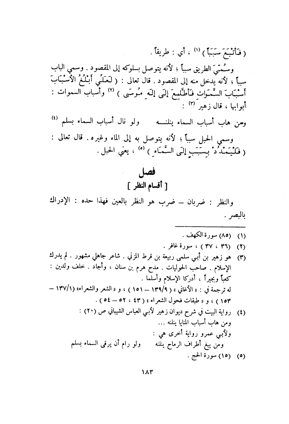 وسمي الطريق سببًا؛ لأنه يتوصل بسلوكه إلى المقصود. وسمي الباب سببًا؛ لأنه يدخل منه إلى المقصود. قال تعالى: {لَعَلِّي أَبْلُغُ الأَسْبَابَ أَسْبَابَ الْسَّمَوَاتِ فَأَطَّلِعُ إِلَى إِلَهِ مُوسَى} ٢ وأسباب السموات: أبوابها، قال زهير٣: