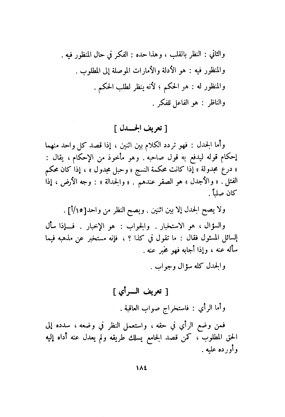 وأما الجدل: فهو تردد الكلام بين اثنين، إذا قصد كل واحد منهما إحكام قوله ليدفع به قول صاحبه. وهو مأخوذ من الإحكام، يقال: درع مجدولة، إذا كانت محكمة النسج، وحبل مجدول، إذا كان محكم الفتل. والأجدل، هو الصقر عندهم. والجدالة: وجه الأرض، إذا كان صلبًا.
