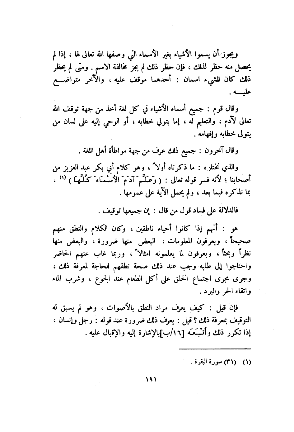 فالدلالة على فساد قول من قال: إن جميعها توقيف هو: أنهم إذا كانوا أحياء ناطقين، وكان الكلام والنطق منهم صحيحًا، ويعرفون المعلومات، البعض منها ضرورة، والبعض منها نظرًا وبحثًا، ويعرفون لما يعلمونه أمثالا، وربما غاب عنهم الحاضر واحتاجوا إلى طلبه، وجب عند ذلك صحة نطقهم للحاجة لمعرفة ذلك، وجرى مجرى اجتماع الخلق على أكل الطعام عند الجوع، وشرب الماء واتقاء الحر والبرد.