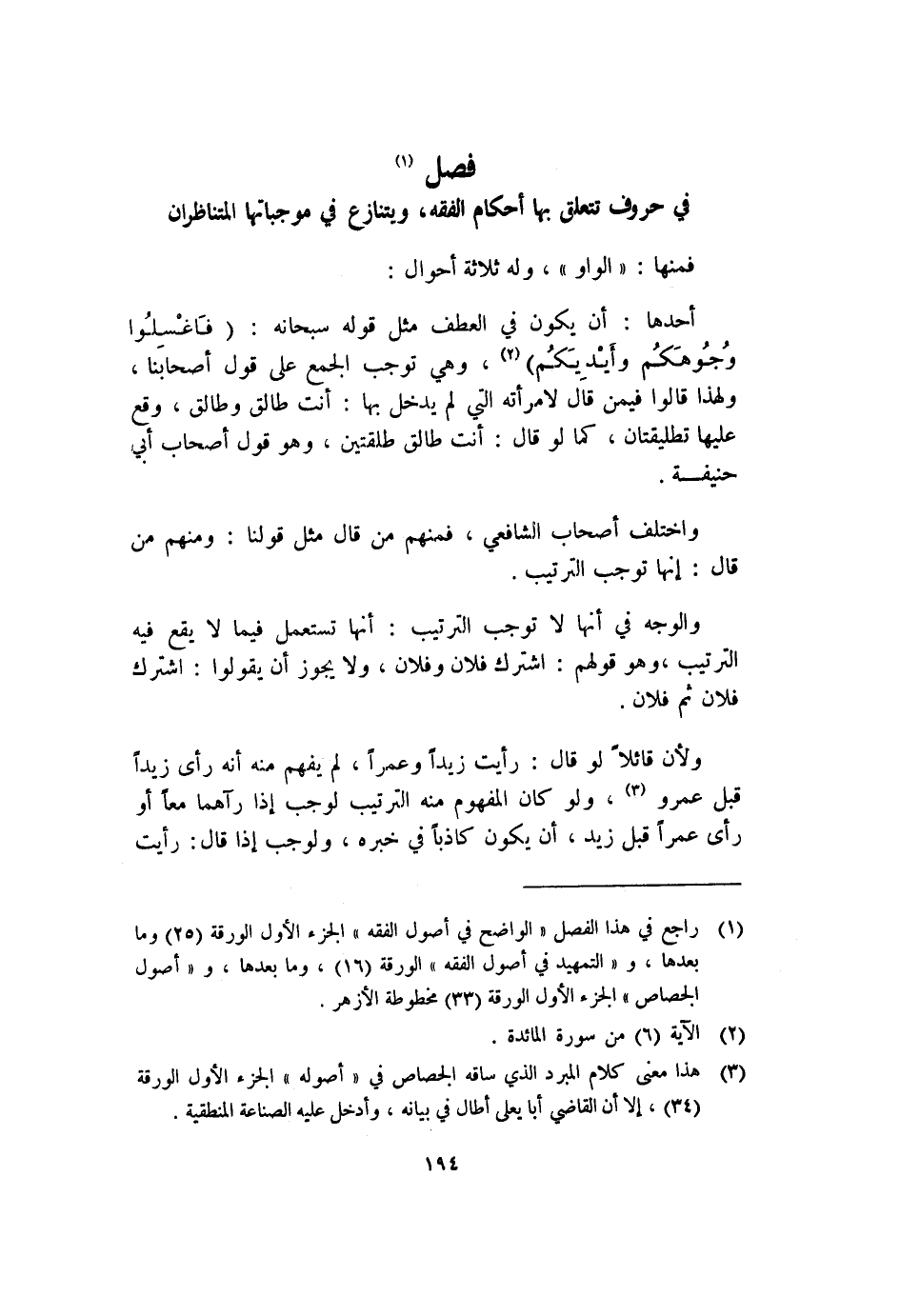 فصل ١: في حروف تتعلق بها أحكام الفقه، ويتنازع في موجباتها المتناظران: