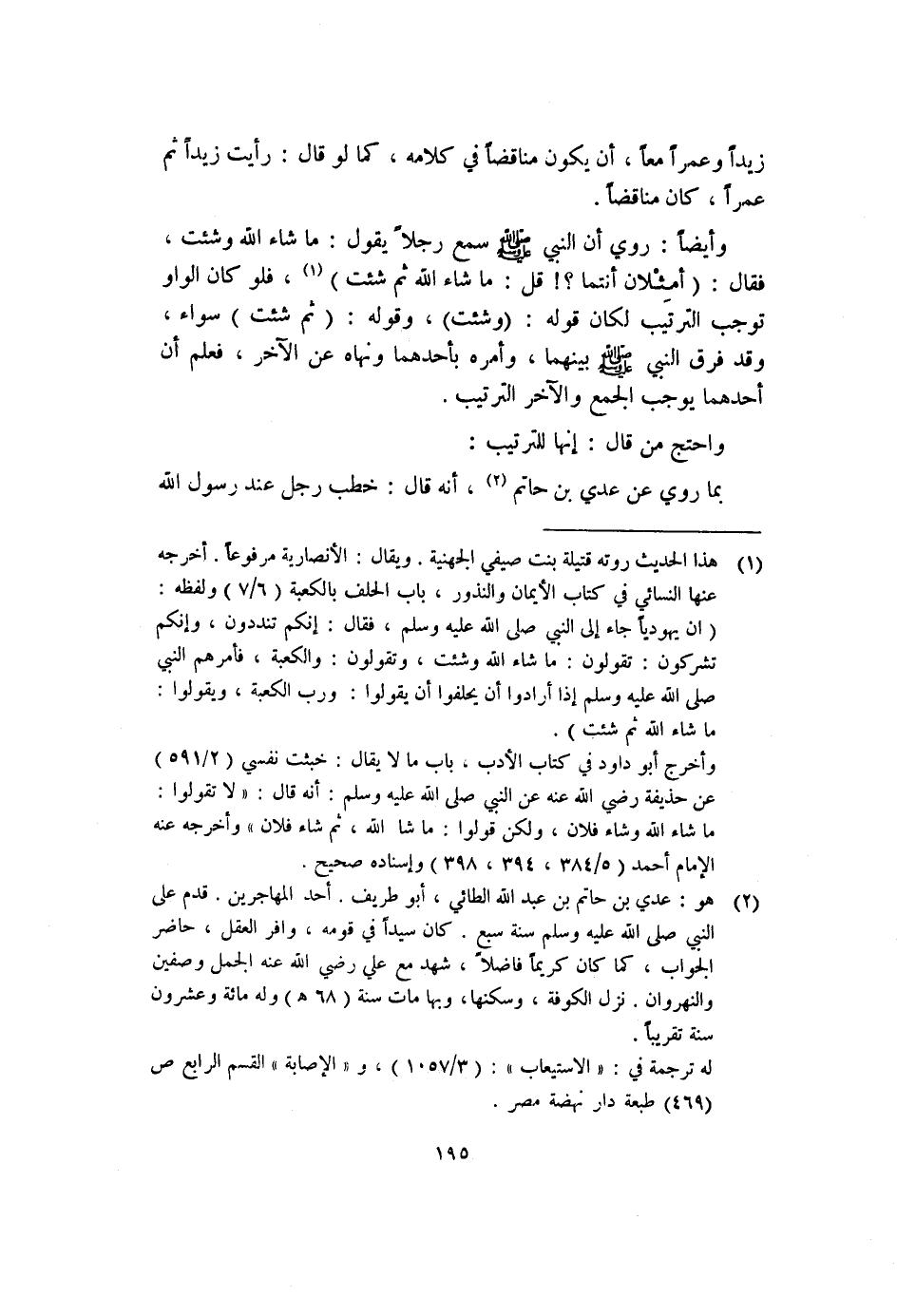 وأيضًا روي أن النبي -صلى الله عليه وسلم- سمع رجلا يقول: ما شاء الله وشئت، فقال: "أمثلان أنتما؟! قل: ما شاء الله ثم شئت"١، فلو كان الواو توجب الترتيب لكان قوله: وشئت، وقوله: ثم شئت- سواء، وقد فرق النبي -صلى الله عليه وسلم- بينهما، وأمره بأحدهما ونهاه عن الآخر، فعلم أن أحدهما يوجب الجمع والآخر الترتيب.