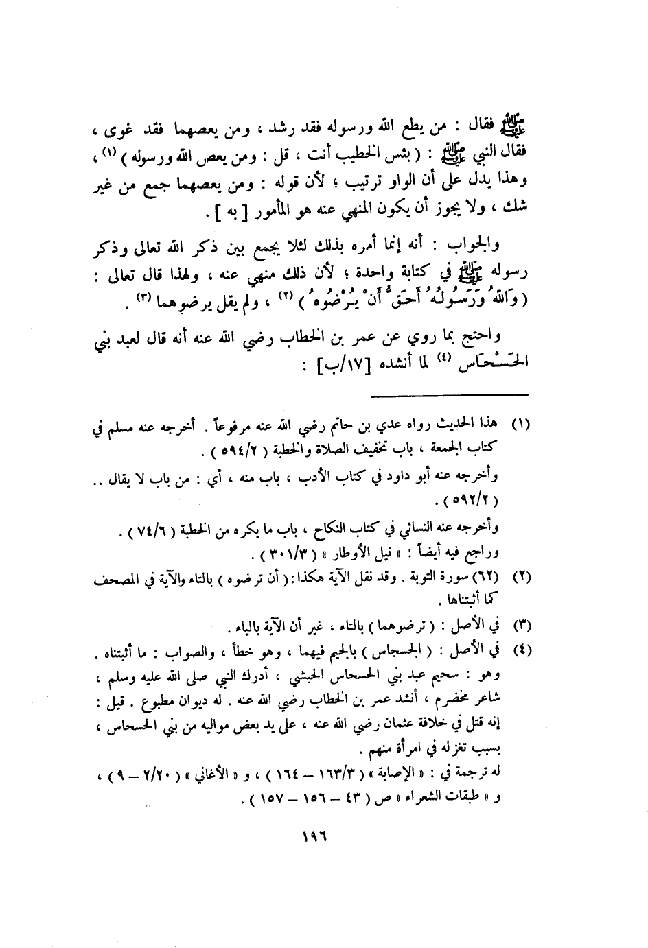 صلى الله عليه وسلم فقال: من يطع الله ورسوله فقد رشد، ومن يعصهما فقد غوى، فقال النبي صلى الله عليه وسلم: "بئس الخطيب أنت، قل: ومن يعص الله ورسوله" ١، وهذا يدل على أن الواو ترتيب؛ لأن قوله: ومن يعصهما جمع من غير شك، ولا يجوز أن يكون المنهي عنه هو المأمور [به] .