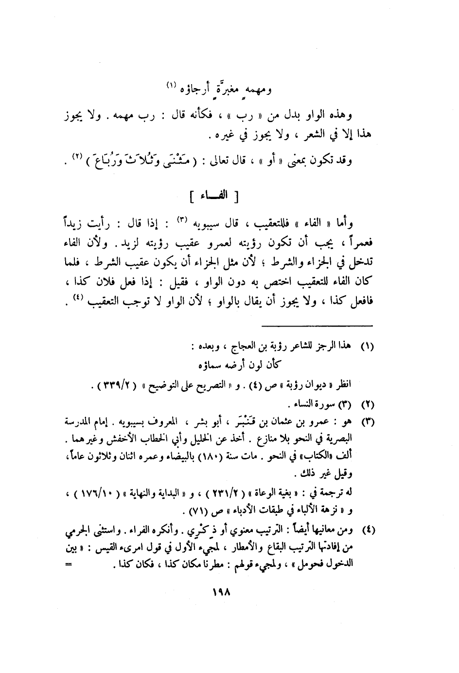 وأما "الفاء" فللتعقيب، قال سيبويه١: إذا قال: رأيت زيدًا فعَمْرًا، يجب أن تكون رؤيته لعمرو عقيب رؤيته لزيد، ولأن "الفاء" تدخل في الجزاء والشرط؛ لأن مثل الجزاء أن يكون عقيب الشرط، فلما كان "الفاء" للتعقيب اختص به دون الواو، فقيل: إذا فعل فلان كذا، فافعل كذا، ولا يجوز أن يقال بالواو؛ لأن الواو لا توجب التعقيب٢.