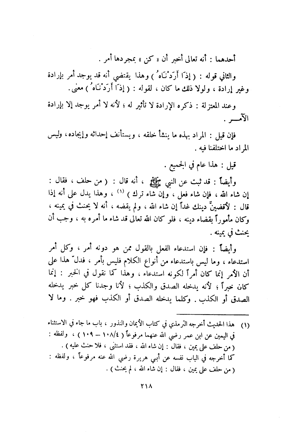 وأيضًا: قد ثبت عن النبي -صلى الله عليه وسلم- أنه قال: "من حلف، فقال: إن شاء الله، فإن شاء فعل، وإن شاء ترك" ١، وهذا يدل على أنه إذا قال: لأقضين دينك غدًا -إن شاء الله- ولم يقضه، أنه لا يحنث في يمينه، وكان مأمورًا بقضاء دينه، فلو كان الله تعالى قد شاء ما أمره به، وجب أن يحنث في يمينه.