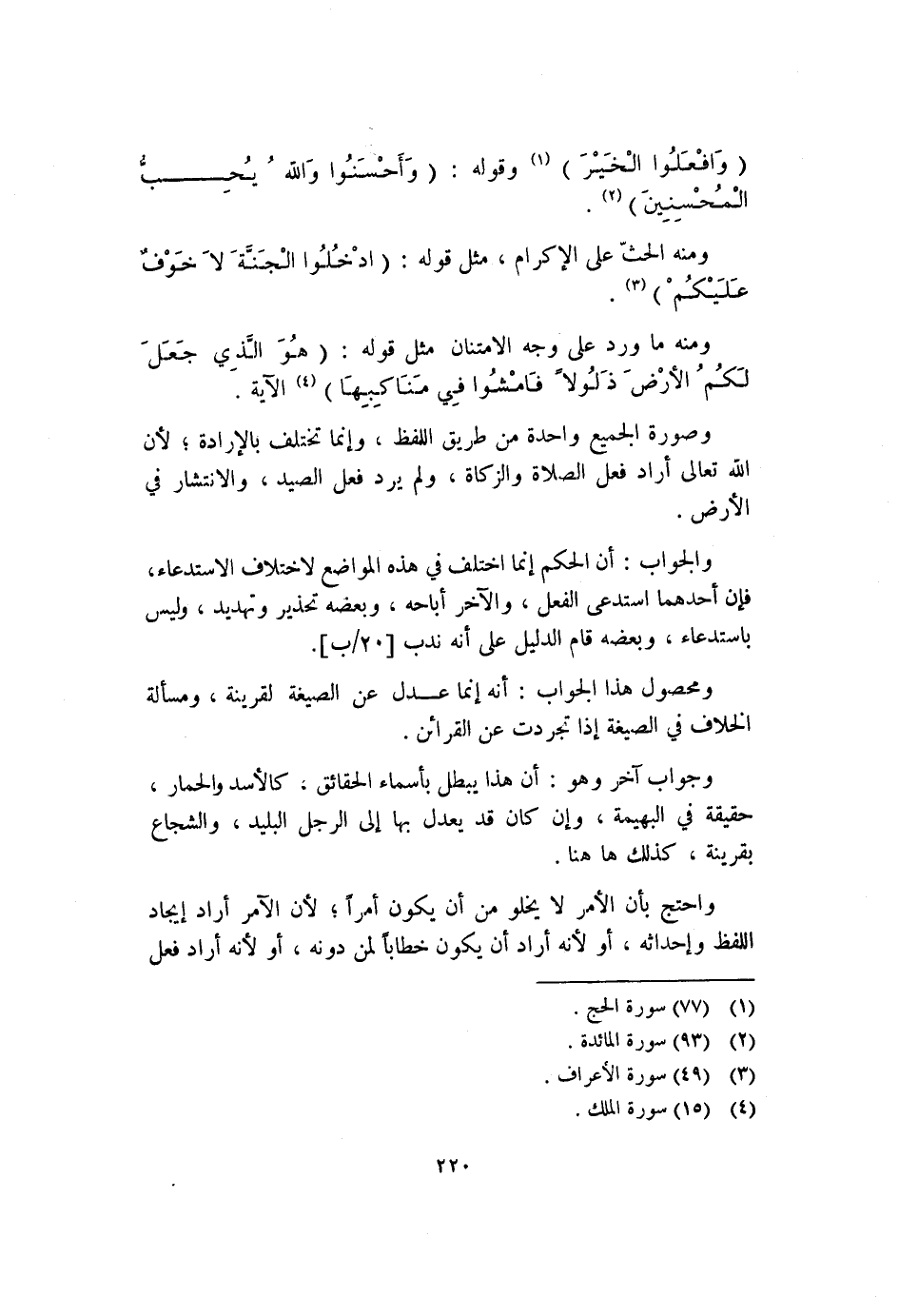 والجواب: أن الحكم إنما اختلف في هذه المواضع لاختلاف الاستدعاء، فإن أحدهما استدعى الفعل، والآخر أباحه، وبعضه تحذير وتهديد، وليس باستدعاء، وبعضه قام الدليل على أنه ندب [٢٠/ ب] .