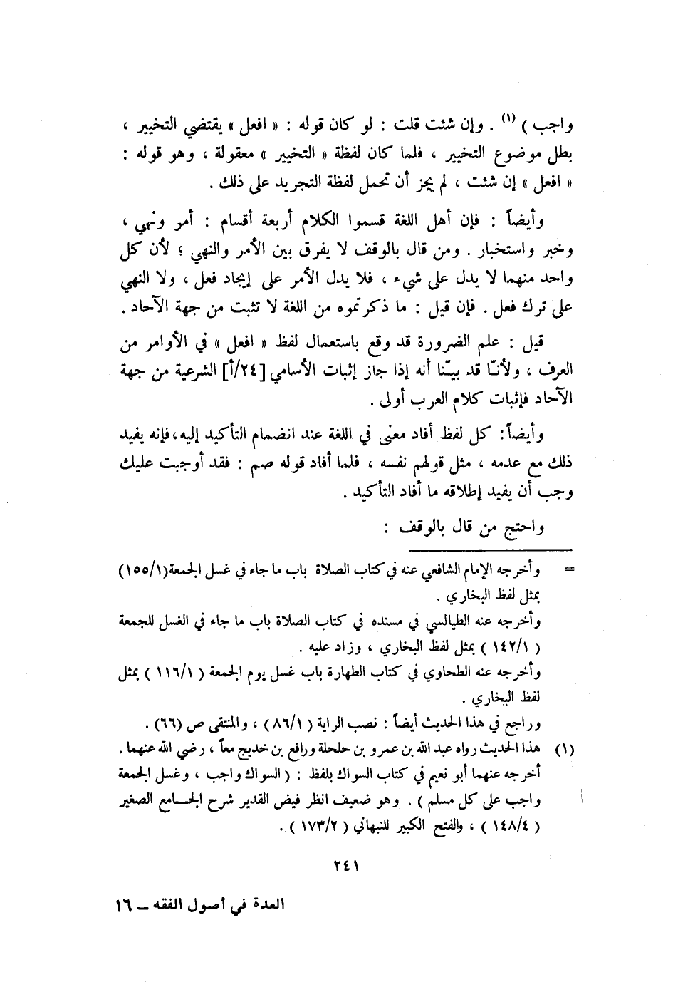 وأيضًا: فإن أهل اللغة قسموا الكلام أربعة أقسام: أمر ونهي، وخبر واستخبار. ومن قال بالوقف لا يفرق بين الأمر والنهي؛ لأن كل واحد منهما لا يدل على شيء، فلا يدل الأمر على إيجاد فعل، ولا النهي على ترك فعل. فإن قيل: ما ذكرتموه من اللغة لا تثبت من جهة الآحاد.