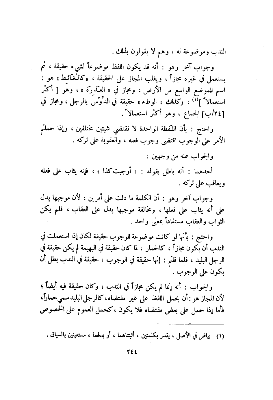 والجواب: أنه إنما لم يكن مجازًا في النَّدب، وكان حقيقة فيه أيضًا؛ لأن المجاز هو: أن يُحْمَلَ اللفظ على غير مقتضاه، كالرجل البليد يسمَّى حمارًا، فأما إذا حُمِلَ على بعض مقتضاه فلا يكون، كحمل العموم على الخصوص