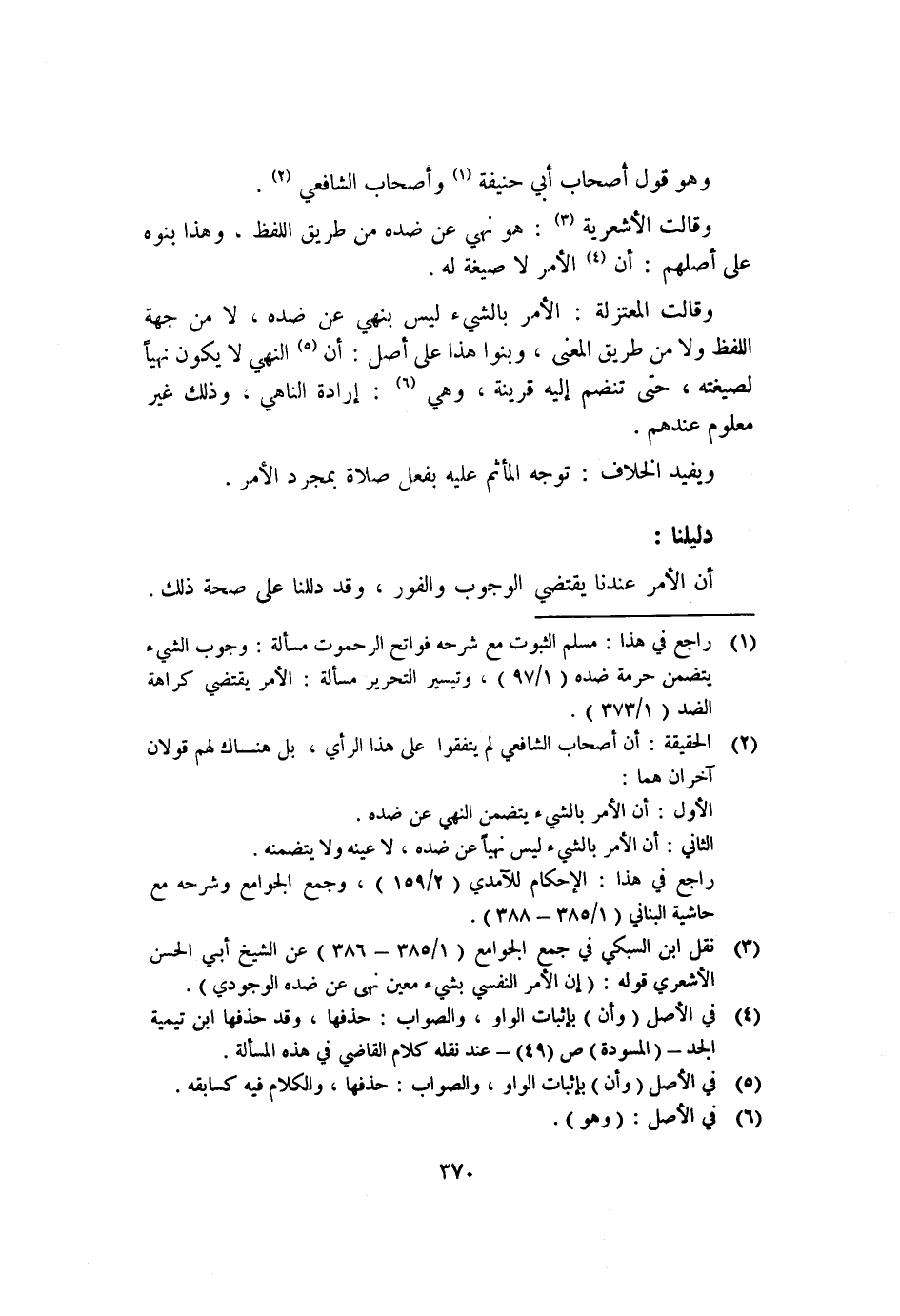 ٣ نقل ابن السبكي في جمع الجوامع "١/٣٨٥-٣٨٦" عن الشيخ أبي الحسن الأشعري قوله: "إن الأمر النفسي بشيء معين نهى عن ضده الوجودي".