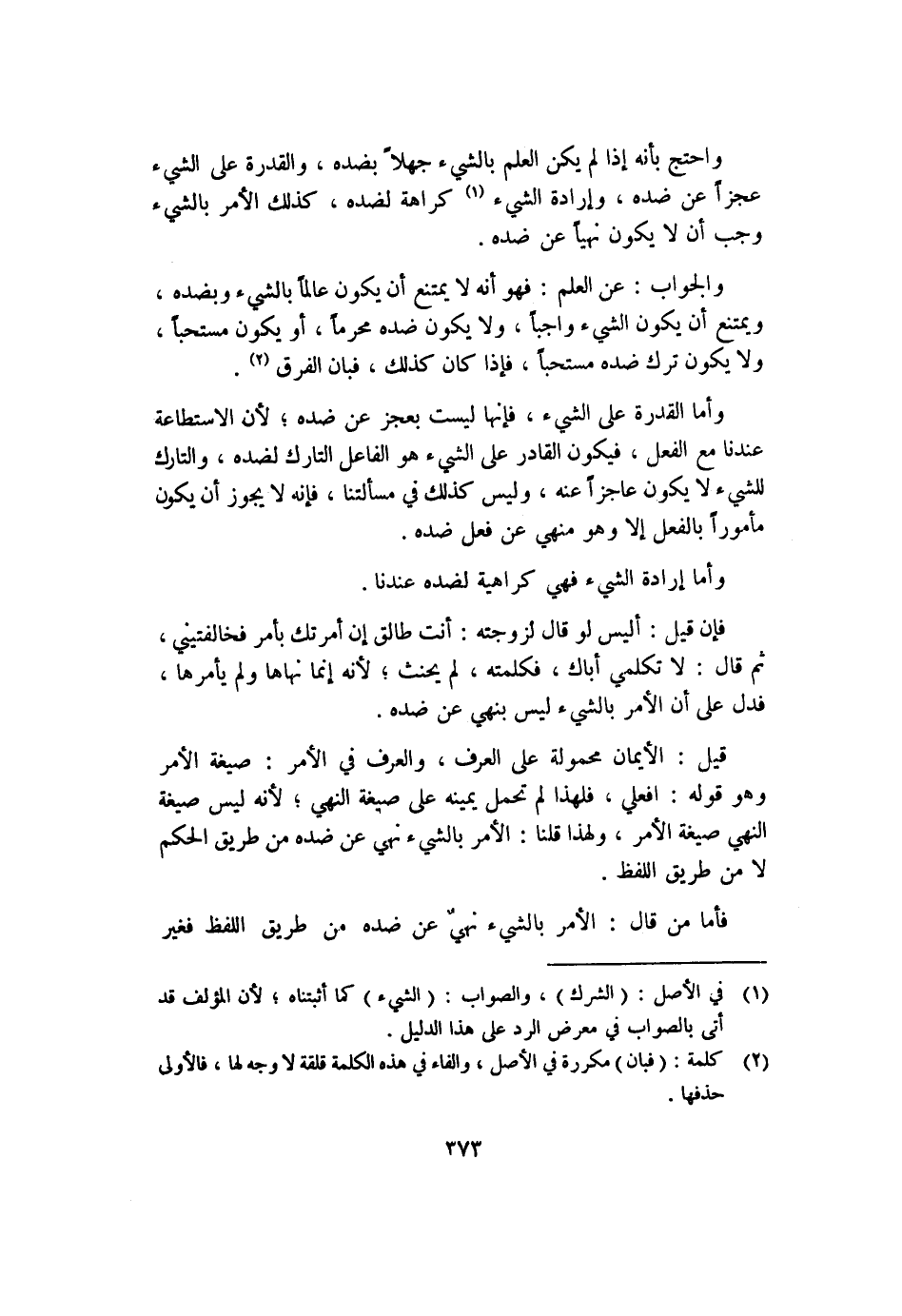 والجواب: عن العلم: فهو أنه لا يمتنع أن يكون عالمًا بالشيء وبضده، ويمتنع أن يكون الشيء واجبًا، ولا يكون ضده محرمًا، أو يكون مستحبًا، ولا يكون ترك ضده مستحبًا؛ فإذا كان كذلك؛ فبان الفرق٢.