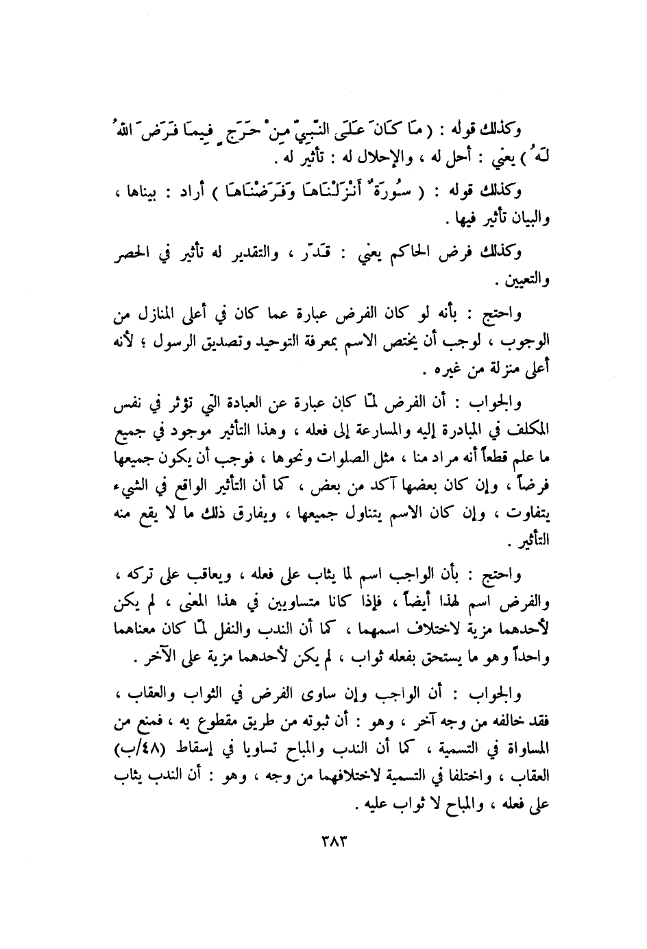 والجواب: أن الواجب وإن ساوى الفرض في الثواب والعقاب؛ فقد خالفه من وجه آخر، وهو: أن ثبوته من طريق مقطوع به، فمنع من المساواة في التسمية، كما أن الندب والمباح تساويا في إسقاط [٤٨/ب] العقاب، واختلفا في التسمية لاختلافهما من وجه، وهو: أن الندب يثاب على فعله، والمباح لا ثواب عليه.