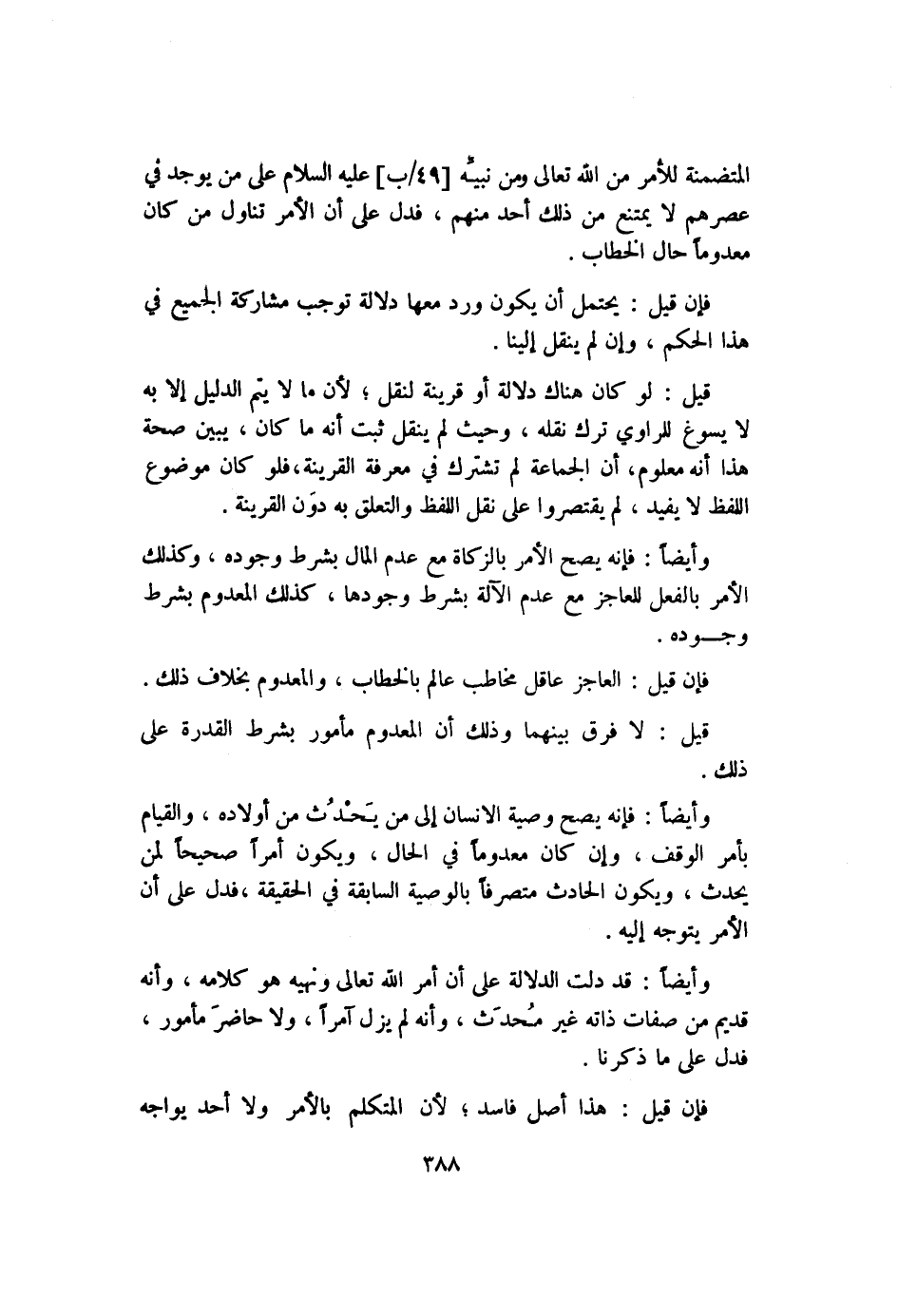 وأيضًا: فإنه يصح الأمر بالزكاة مع عدم المال بشرط وجوده، وكذلك الأمر بالفعل للعاجز مع عدم الآلة بشرط وجودها، كذلك المعدوم بشرط وجوده.