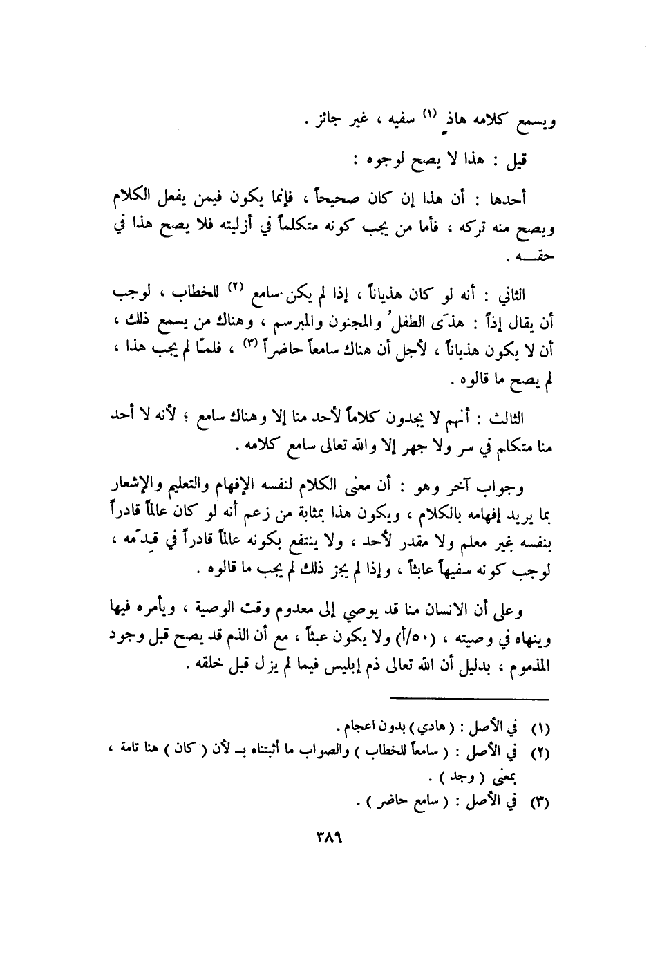 وجواب آخر وهو: أن معنى الكلام لنفسه الإفهام والتعليم والإشعار بما يريد إفهامه بالكلام، ويكون هذا بمثابة من زعم أنه لو كان عالمًا قادر بنفسه غير معلم ولا مقدر لأحد، ولا ينتفع بكونه عالمًا قادرًا في قدمه؛ لوجب كونه سفيهًا عابثًا، وإذا لم يجز ذلك لم يجب ما قالوه.