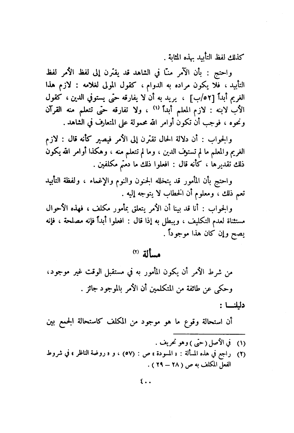١ راجع في هذه المسألة: "المسودة" "ص٥٧"، وروضة الناظر في شروط الفعل المكلف به ص "٢٨-٢٩".