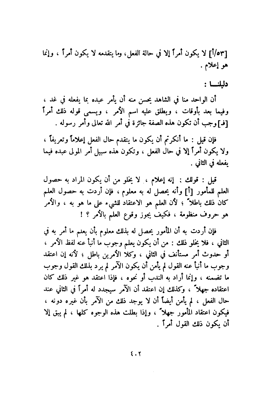فإن أردت به أن المأمور يحصل له بذلك معلوم بأن يعلم ما أمر به في الثاني؛ فلا يخلو ذلك: من أن يكون يعلم وجوب ما أنبأ عنه لفظ الأمر، أو حدوث أمر مستأنف في الثاني، وكلا الأمرين باطل؛ لأنه إن اعتقد وجوب ما أنبأ عنه القول؛ لم يأمن أن يكون الآمر لم يرد بذلك القول وجوب ما تضمنه؛ وإنما أراد به الندب أو نحوه؛ فإذا اعتقد هو غير ذلك؛ كان اعتقاده جهلًا، وكذلك إن اعتقد أن الأمر سيجدد له أمرًا في الثاني عند حال الفعل، لم يأمن أيضًا أن لا يوجد ذلك من الآمر بأن غيره دونه، فيكون اعتقاد المأمور جهلًا، وإذا بطلت هذه الوجوه كلها؛ لم يبق إلا أن يكون ذلك القول أمرًا.