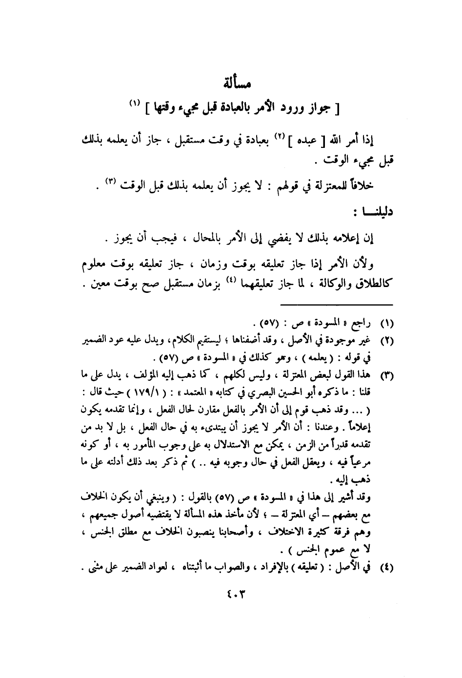 وقد أشير إلى هذا في "المسودة" ص "٥٧" بالقول: "وينبغي أن يكون الخلاف مع بعضهم -أي المعتزلة؛ لأن مأخذ هذه المسألة لا يقتضيه أصول جميعهم، وهم فرقة كثيرة الاختلاف، وأصحابنا ينصبون الخلاف مع مطلق الجنس، لا مع عموم الجنس".