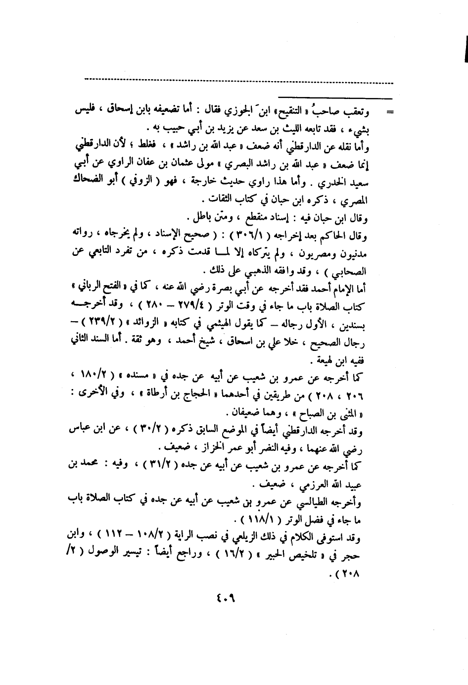 = وتعقب صاحب "التنقيح" ابن الجوزي فقال: أما تضعيفه بابن إسحاق؛ فليس بشيء، فقد تابعه الليث بن سعد عن يزيد بن أبي حبيب به.
