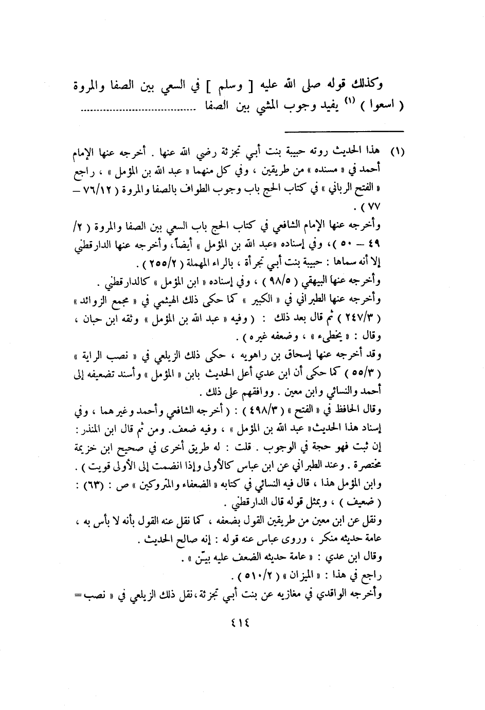 ١ هذا الحديث روته حبيبة بنت أبي تجزئة رضي الله عنها. أخرجه عنها الإمام أحمد في "مسنده" من طريقين، وفي كل منهما "عبد الله بن المؤمل"، راجع الفتح الرباني في كتاب الحج باب وجوب الطواف بالصفا والمروة "٧٦/١٢-٧٧".
