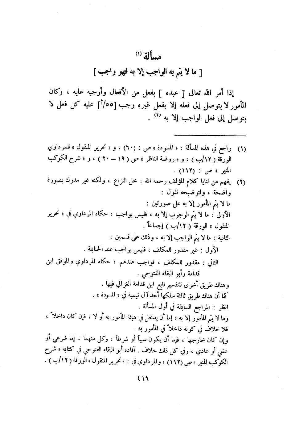 إذا أمر الله تعالى [عبده] بفعل من الأفعال وأوجبه عيله، وكان المأمور لا يتوصل إلى فعله إلا بفعل غيره؛ وجب [٥٥/أ] عليه كل فعل لا يتوصل إلى فعل الواجب إلا به٢.