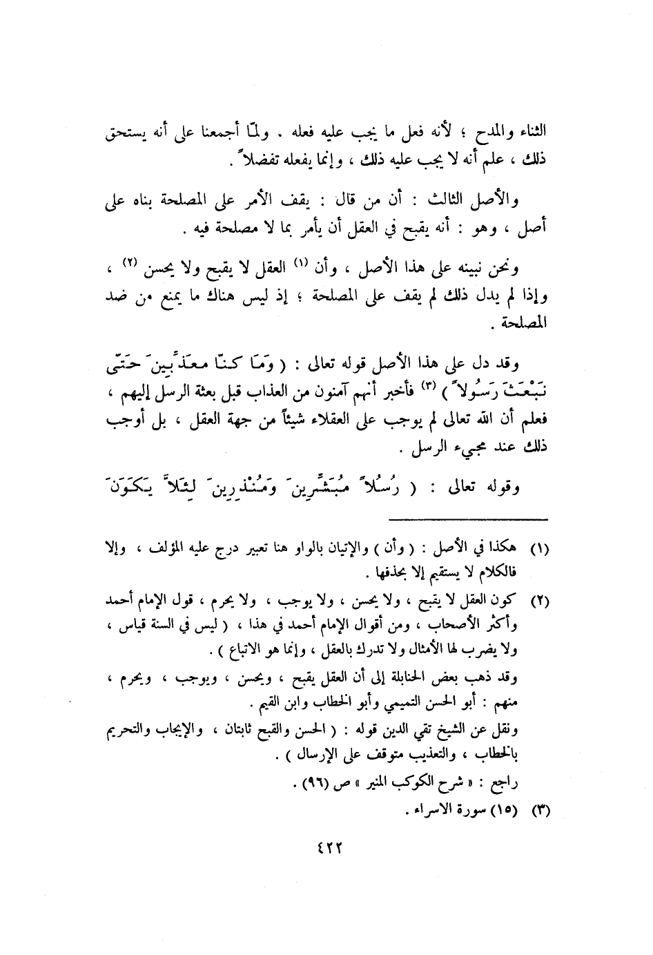 ونقل عن الشيخ تقي الدين قوله: "الحسن والقبح ثابتان، والإيجاب والتحريم بالخطاب، والتعذيب متوقف على الإرسال".