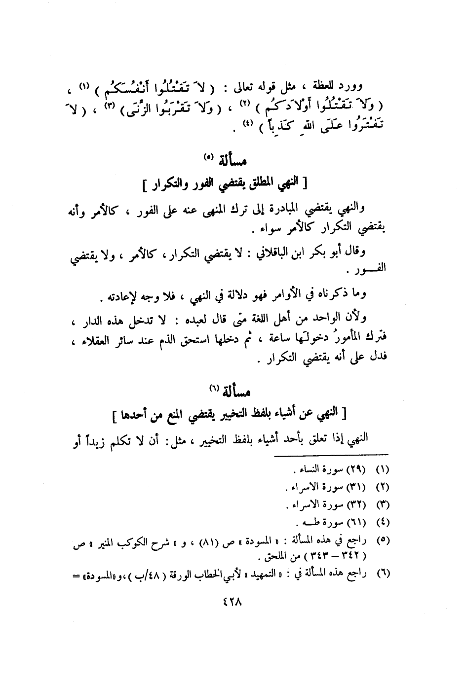 ١ راجع في هذه المسألة: "المسودة" ص"٨١"، وشرح الكوكب المنير ص"٣٤٢-٣٤٣" من الملحق.