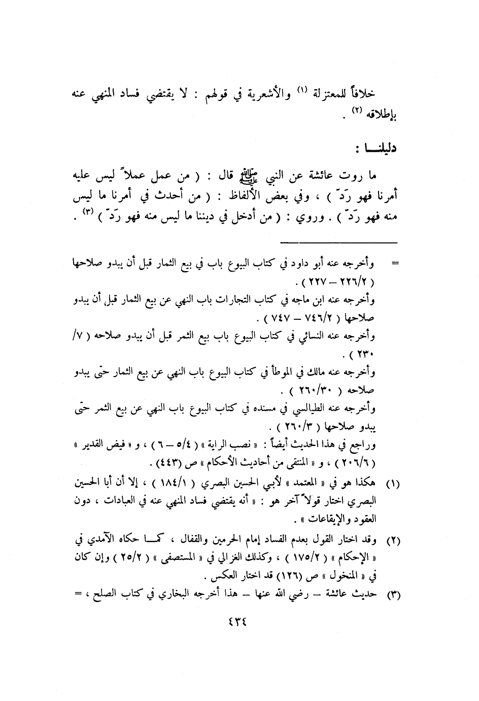 ما روت عائشة عن النبي صلى الله عليه وسلم قال: "من عمل عملًا ليس عليه أمرنا؛ فهو رد"، وفي بعض الألفاظ: "من أحدث في أمرنا ما ليس منه؛ فهو رد". وروى: "من أدخل في ديننا ما ليس منه فهو رد" ١.