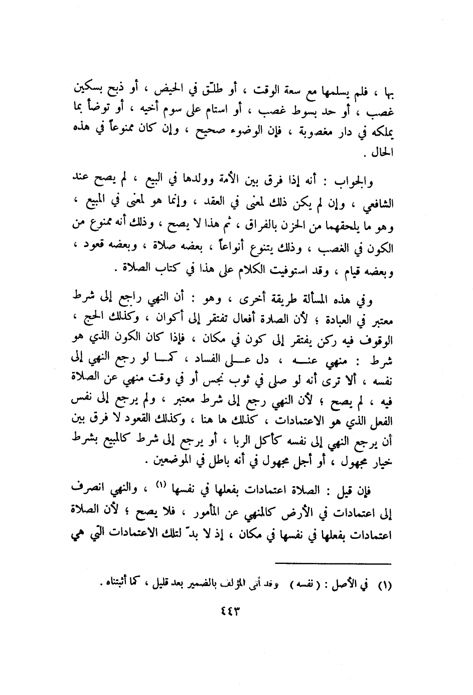 وفي هذه المسألة طريقة أخرى، وهو: أن النهي راجع إلى شرط معتبر في العبادة؛ لأن الصلاة أفعال تفتقر إلى أكوان، وكذلك الحج، الوقوف فيه ركن يفتقر إلى كون في مكان؛ فإذا كان الكون الذي هو شرط: منهي عنه دل على الفساد، كما لو رجع النهي إلى نفسه، ألا ترى أنه لو صلى في ثوب نجس أو في وقت منهي عن الصلاة فيه، لم يصح؛ لأن النهي رجع إلى شرط معتبر، ولم يرجع إلى نفس الفعل الذي هو الاعتمادات، كذلك ههنا، وكذلك القعود لا فرق بين أن يرجع النهي إلى نفسه كأكل الربا، أو يرجع إلى شرط كالمبيع بشرط خيار مجهول، أو أجل مجهول في أنه باطل في الموضعين.