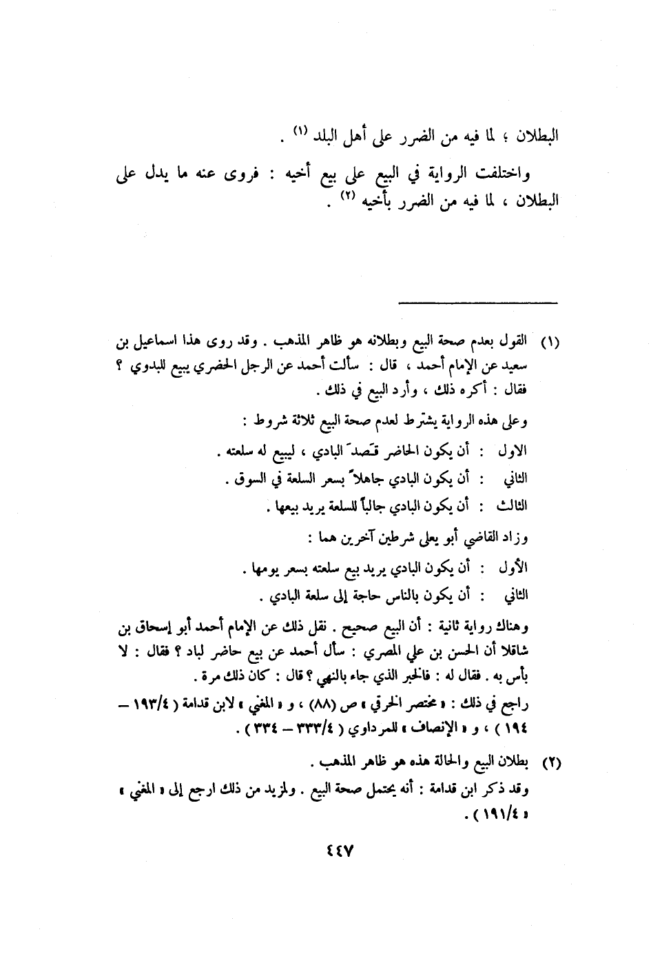 ١القول بعدم صحة البيع وبطلانه هو ظاهر المذهب، وقد روى هذا إسماعيل بن سعيد عن الإمام أحمد، قال: سألت أحمد عن الرجل الحضري يبيع للبدوي؟
