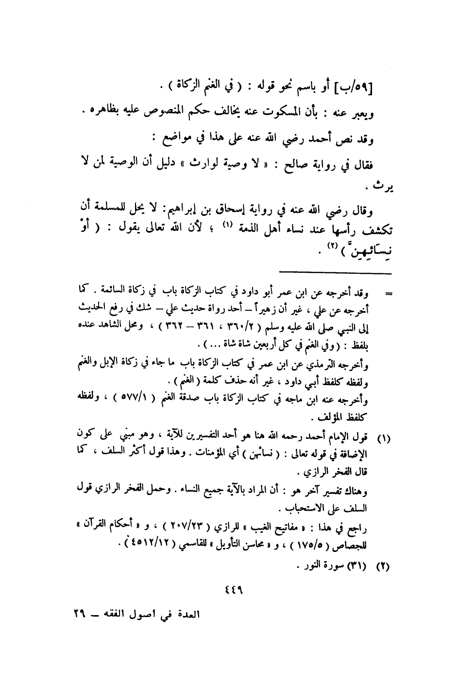 ١ قول الإمام أحمد رحمه الله هنا هو أحد التفسيرين للآية، وهو مبني على كون الإضافة في قوله تعالى: {نسائهن} أي المؤمنات. وهذا قول أكثر السلف، كما قال الفخر الرازي.