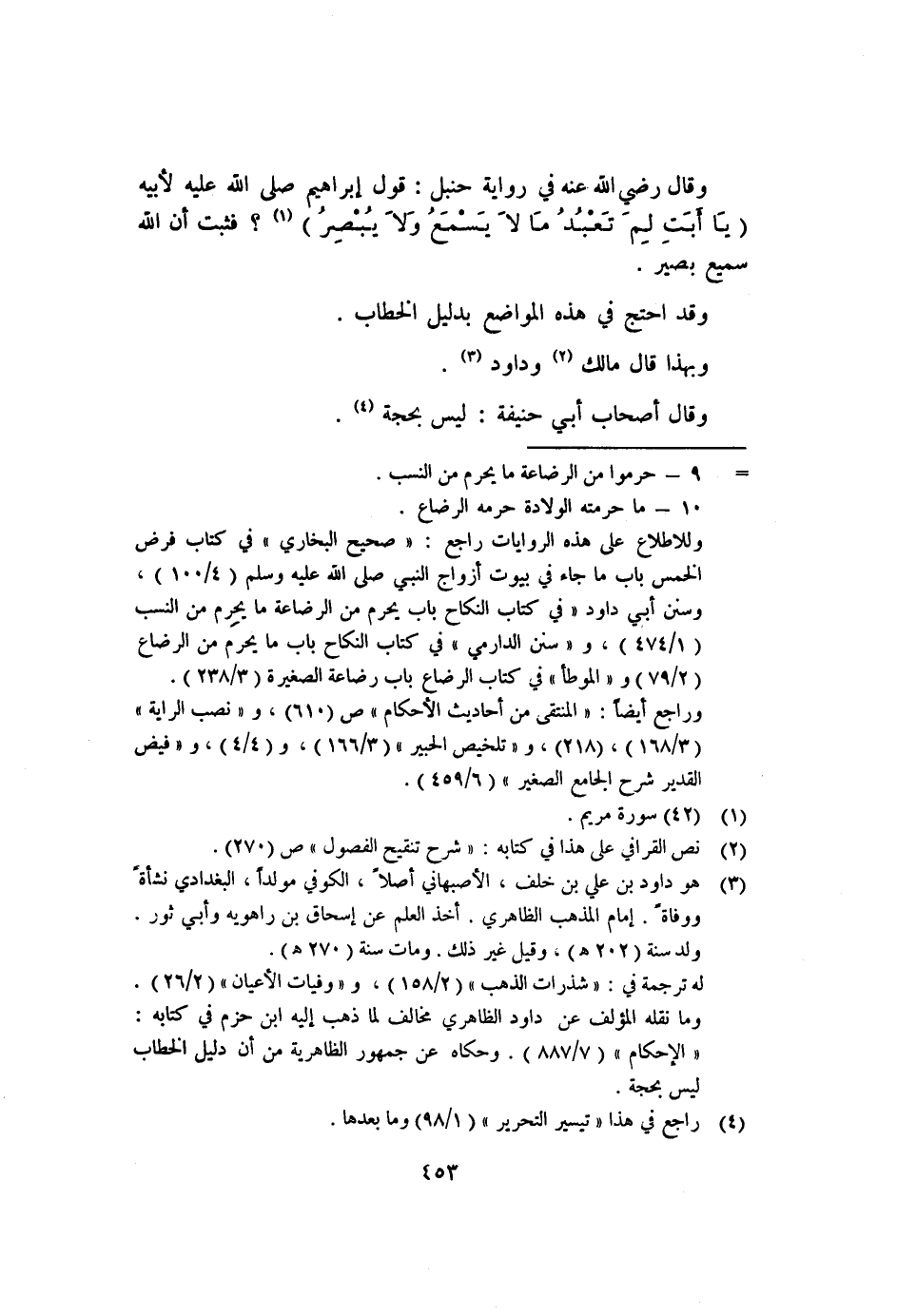 له ترجمة في: "شذرات الذهب": "٢/١٥٨"، و"وفيات الأعيان": "٢/٢٦". وما نقله المؤلف عن داود الظاهري مخالف لما ذهب إليه ابن حزم في كتابه: "الإحكام": "٧/٨٨٧"، وحكاه عن جمهور الظاهرية من أن دليل الخطاب ليس بحجة.