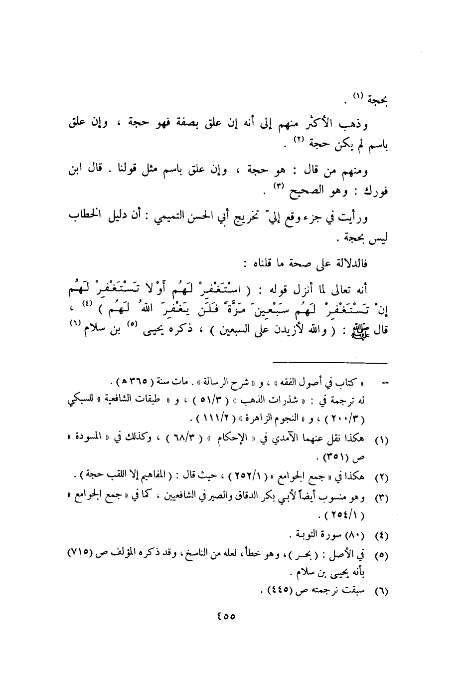 وذهب الأكثر منهم إلى أنه إن علق بصفة؛ فهو حجة، وإن علق باسم؛ لم يكن حجة٢.