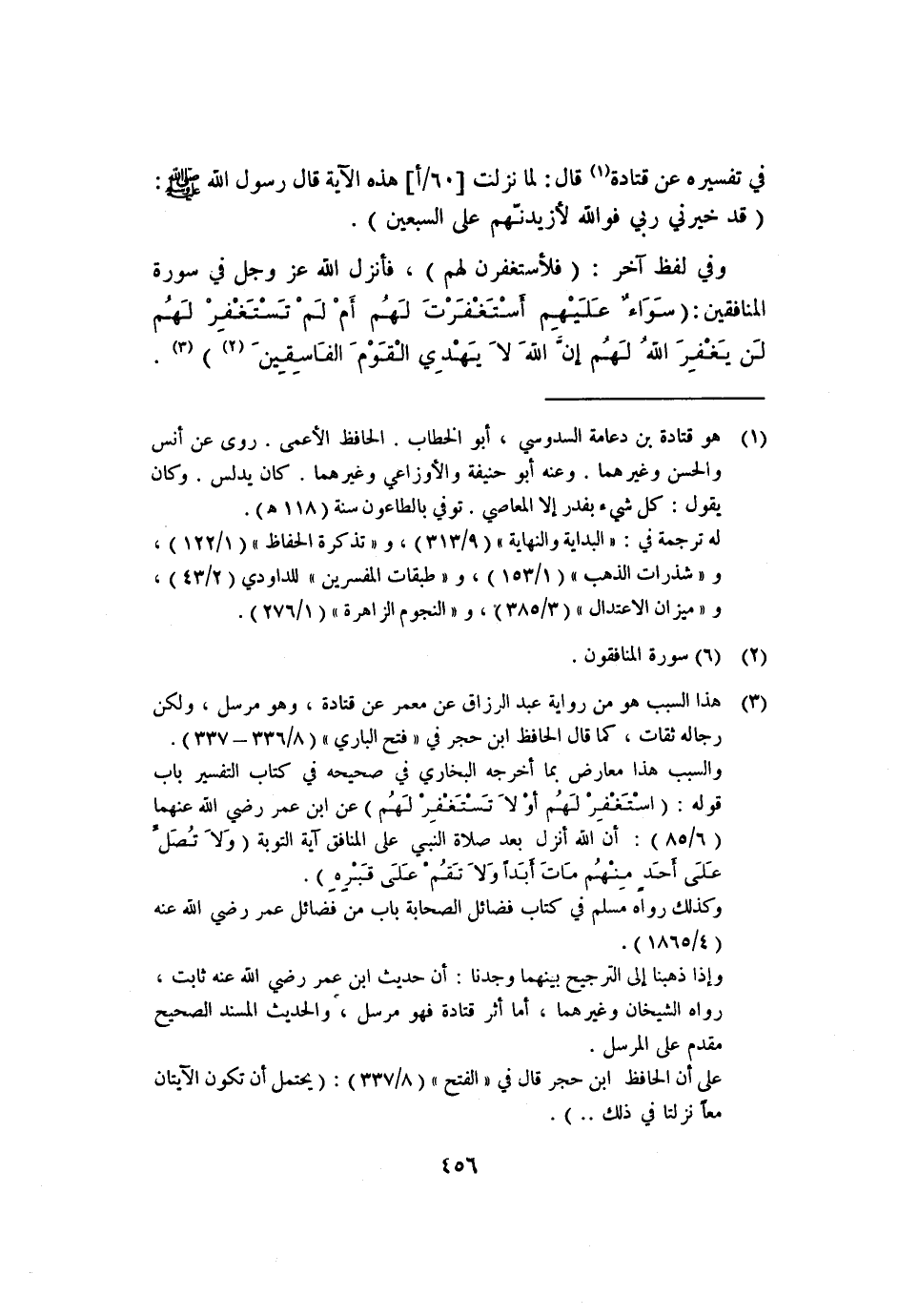 في تفسيره عن قتادة١ قال: لما نزلت [٦٠/أ] هذه الآية قال رسول الله صلى الله عليه وسلم: "قد خيرني ربي فوالله لأزيدنهم على السبعين".