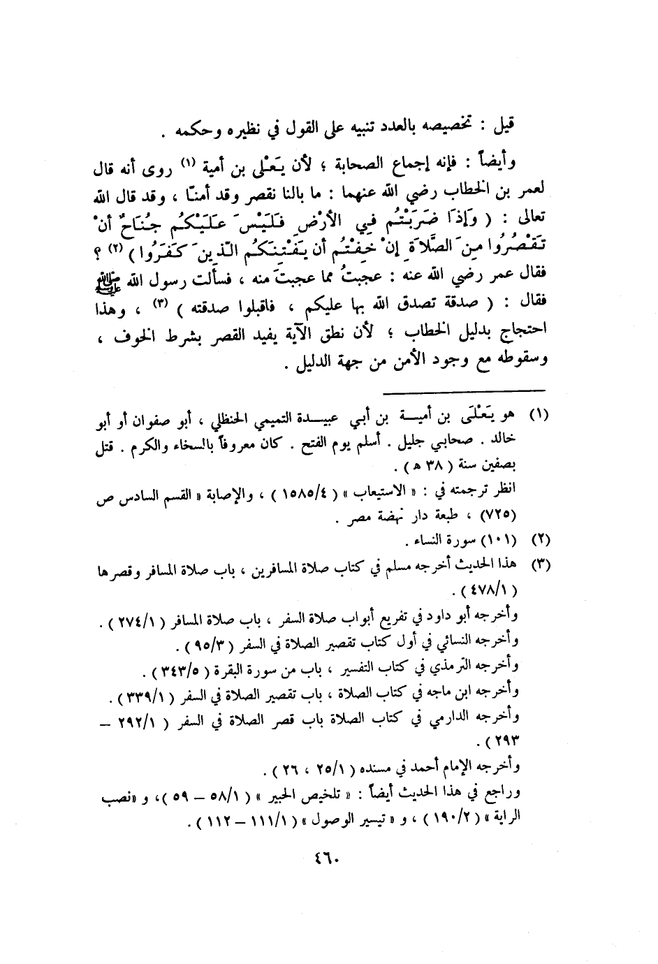 وأيضًا: فإنه إجماع الصحابة؛ لأن يعلى بن أمية١ روى أنه قال لعمر بن الخطاب رضي الله عنهما: ما بالنا نقصر وقد أمنّا، وقد قال الله تعالى: {وَإِذَا ضَرَبْتُمْ فِي الْأَرْضِ فَلَيْسَ عَلَيْكُمْ جُنَاحٌ أَنْ تَقْصُرُوا مِنَ الصَّلاةِ إِنْ خِفْتُمْ أَنْ يَفْتِنَكُمُ الَّذِينَ كَفَرُوا} ٢؟ فقال عمر رضي الله عنه: عجبت مما عجبت منه؛ فسألت رسول الله صلى الله عليه وسلم فقال: "صدقة تصدق الله بها عليكم، فاقبلوا صدقته" ٣، وهذا احتجاج بدليل الخطاب؛ لأن نطق الآية يفيد القصر بشرط الخوف، وسقوطه مع وجود الأمن من جهة الديل.