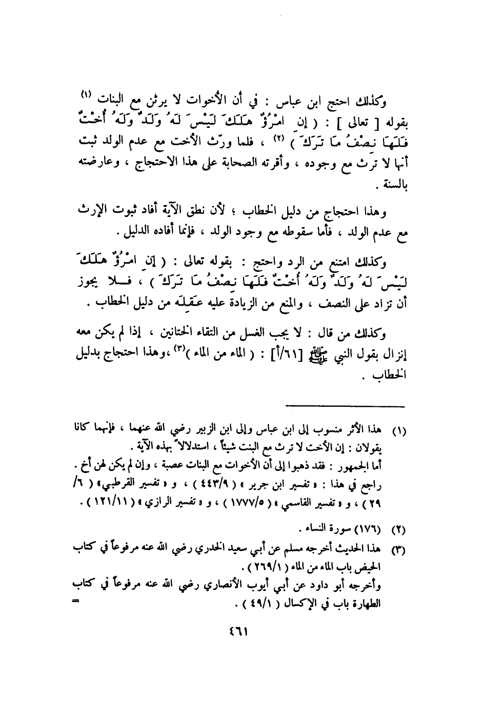 وكذلك من قال: لا يجب الغسل من التقاء الختانين، إذا لم يكن معه إنزال؛ بقول النبي صلى الله عليه وسلم [٦١/أ] : "الماء من الماء" ٣، وهذا احتجاج بدليل الخطاب.
