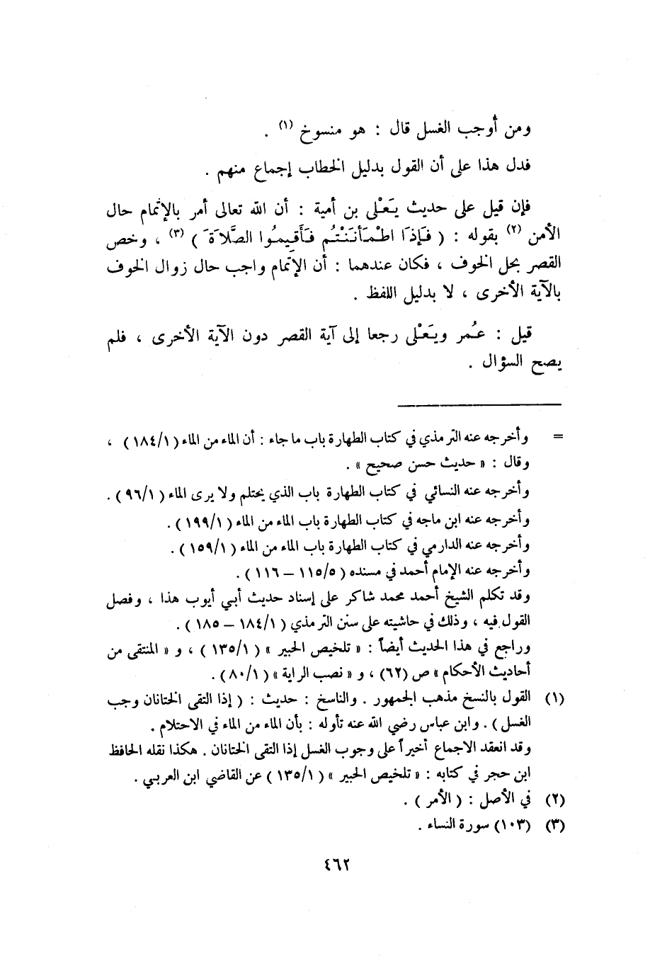 ١ القول بالنسخ مذهب الجمهور، والناسخ: حديث: "إذا التقى الختانان؛ وجب الغسل". وابن عباس رضي الله عنه تأوله: بأن الماء من الماء في الاحتلام.