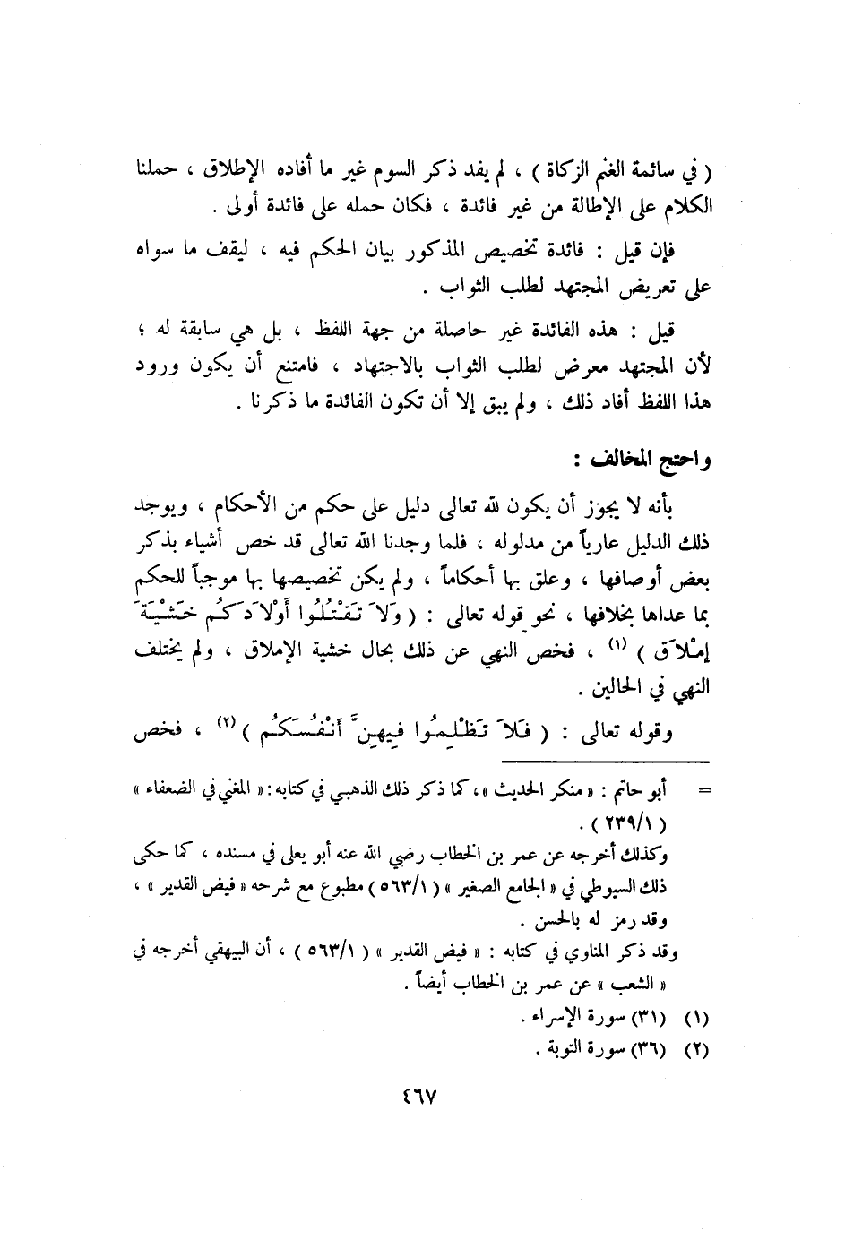 بأنه لا يجوز أن يكون لله تعالى دليل على حكم من الأحكام، ويوجد ذلك الدليل عاريًا من مدلوله؛ فلما وجدنا الله تعالى قد خص أشياء بذكر بعض أوصافها، وعلق بها أحكامًا، ولم يكن تخصيصها بها موجبًا للحكم بما عداها بخلافها، وعلق بها أحكامًا، ولم يكن تخصيصها بها موجبًا للحكم بما عداها بخلافها، نحو قوله تعالى: {وَلا تَقْتُلُوا أَوْلادَكُمْ خَشْيَةَ إِمْلاقٍ} ١؛ فخص النهي عن ذلك بحال خشية الإملاق، ولم يختلف النهي في الحالين.