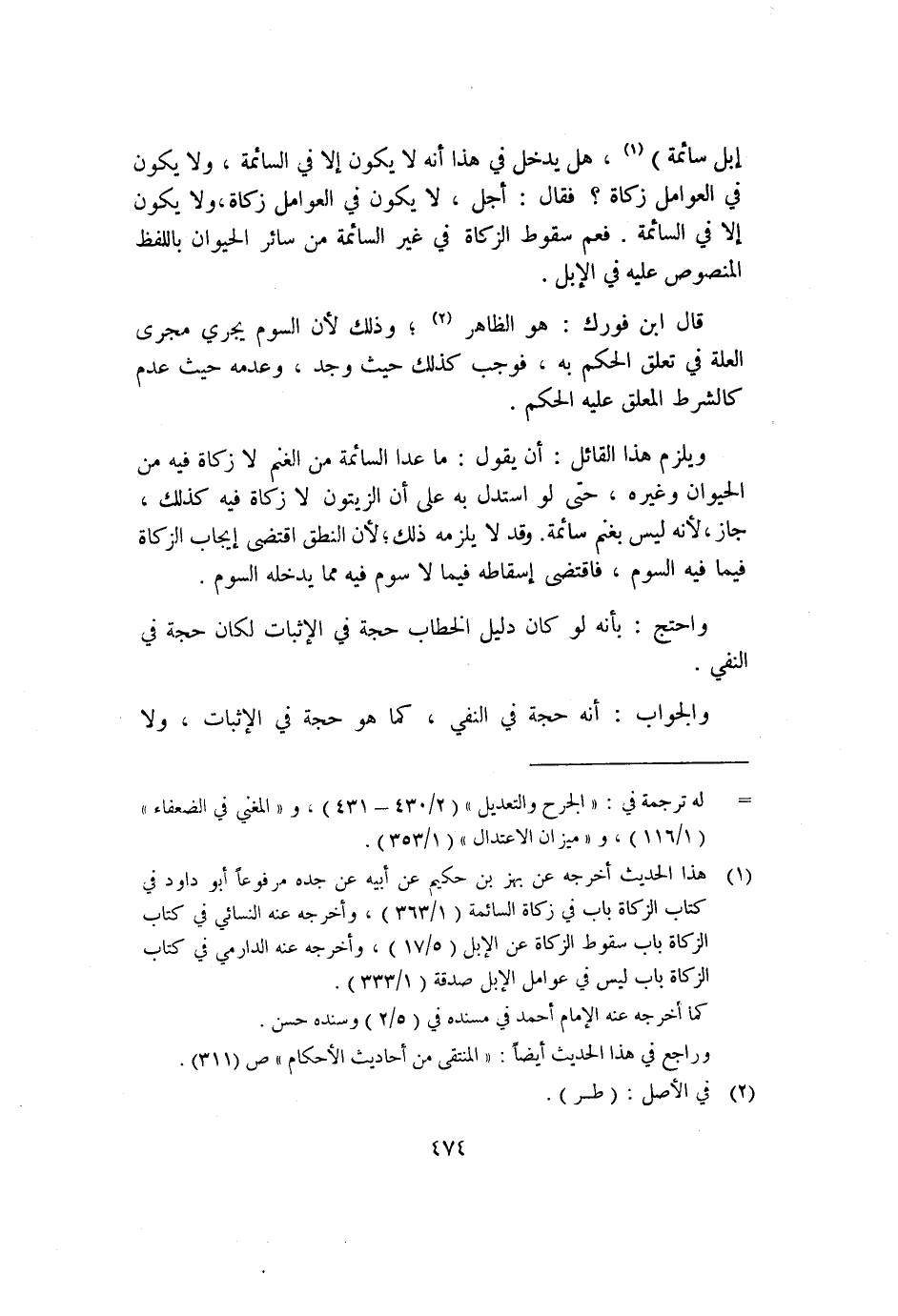إبل سائمة" ١، هل يدخل في هذا أنه لا يكون إلا في السائمة، ولا يكون في العوامل زكاة؟ فقال: أجل، لا يكون في العوامل زكاة، ولا يكون إلا في السائمة؛ فعم سقوط الزكاة في غير السائمة من سائر الحيوان باللفظ المنصوص عليه في الإبل.