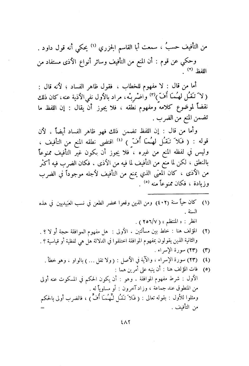وأما من قال: إن اللفظ تضمن ذلك فهو ظاهر الفساد أيضًا؛ لأن قوله: {فَلا تَقُلْ لَهُمَا أُفٍّ} ٤ اقتضى نطقه المنع من التأفيف، وليس في لفظه المنع من غيره؛ فلا يجوز أن يكون غير التأفيف ممنوعًا بالنطق، لكن لما منع من التأفيف من الأذى، فكان الضرب فيه أكثر من الأذى، كان المعنى الذي يمنع من التأفيف لأجله مجودًا في الضرب وزيادة، فكان ممنوعًا منه٥.